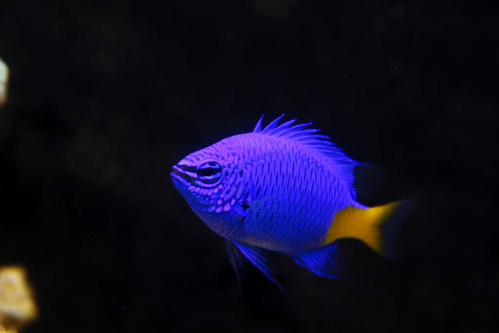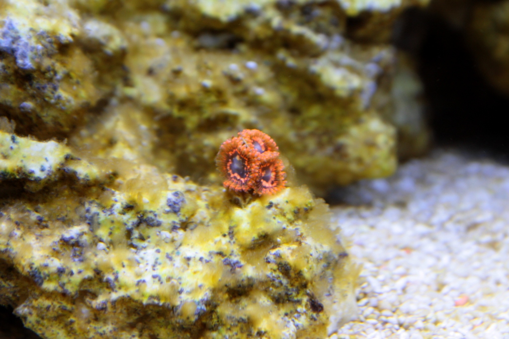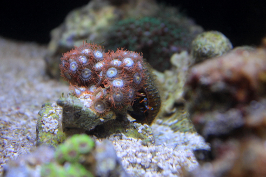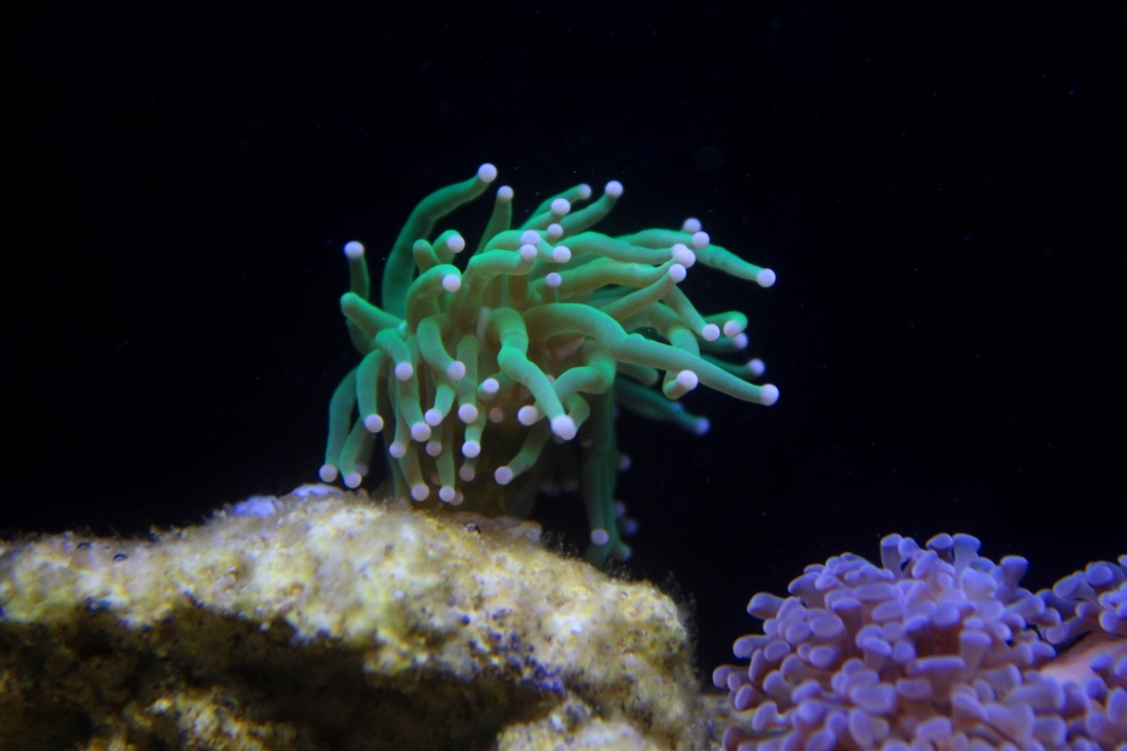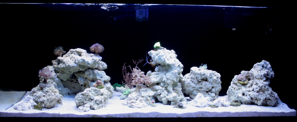 Poniżej zdjęcia na 2 dni po założeniu (pierwsza fotka - tylko belka LED, druga - kombinacje z T5 - ze starymi świetlówkami nie-morskimi): - a tak to się prezentowało na regale nad innym akwarium - azjatyckim strumieniem (szykuje się fajny kontrast dwóch światów