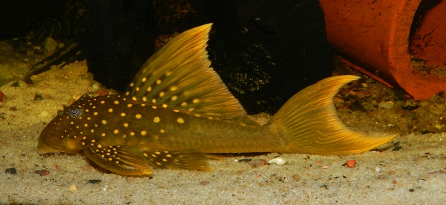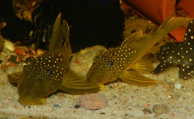 Baryancistrus demantoides i Hemiancistrus subviridis - te dwa zbrojniki u nas w handlu nie są rozróżniane i oba są sprzedawane jako L 200. Różnica polega na wielkości i kształcie płetwy grzbietowej i ogonowej oraz ubarwieniu - jeden jest "bardziej zielony", drugi "bardziej żółty". Z moich obserwacji wynika, że oba gatunki są towarzyskie o spokojnym usposobieniu, nie zauważyłem dużej agresji wewnątrzgatunkowej - jak to zazwyczaj bywa wśród samców zbrojników. Dodatnią cechą L 200 jest to, że są mało płochliwe przez co nie żyją głównie w ukryciu a bardzo dużo czasu spędzają na otwartych przestrzeniach akwarium. Poniżej zdjęcia obu gatunków: