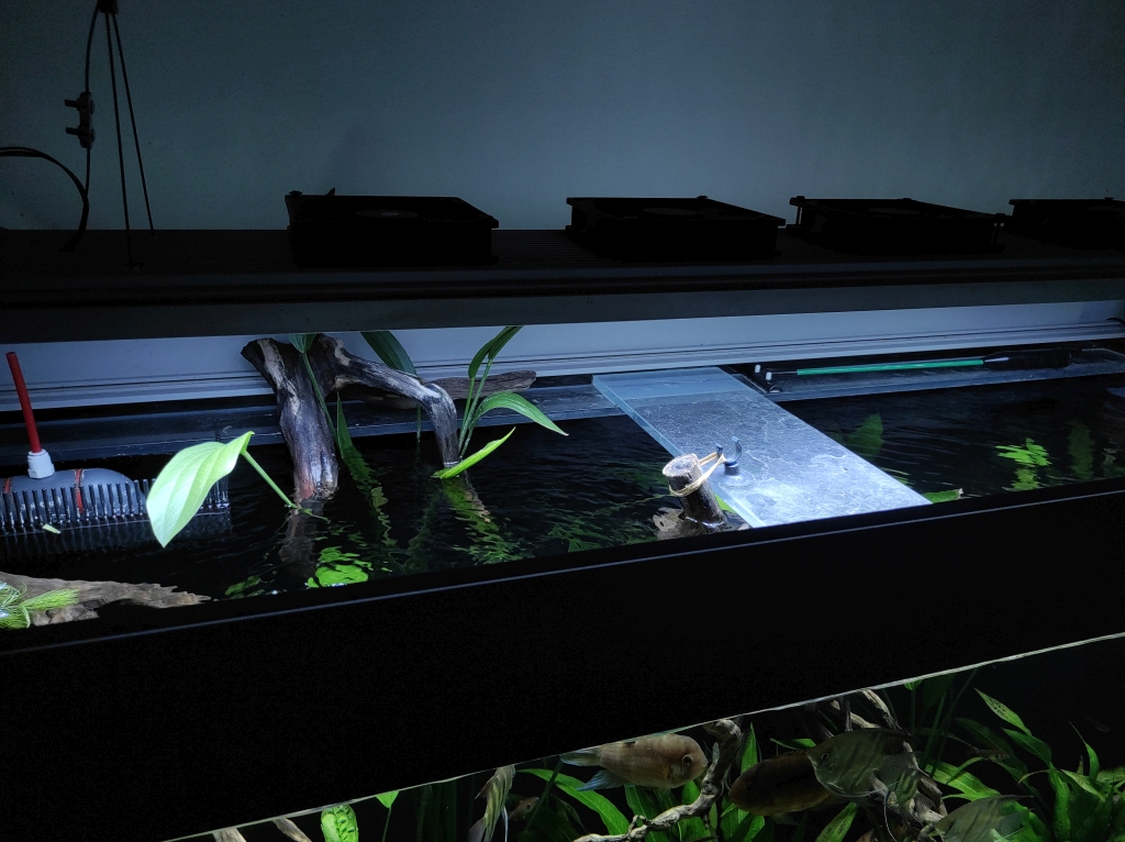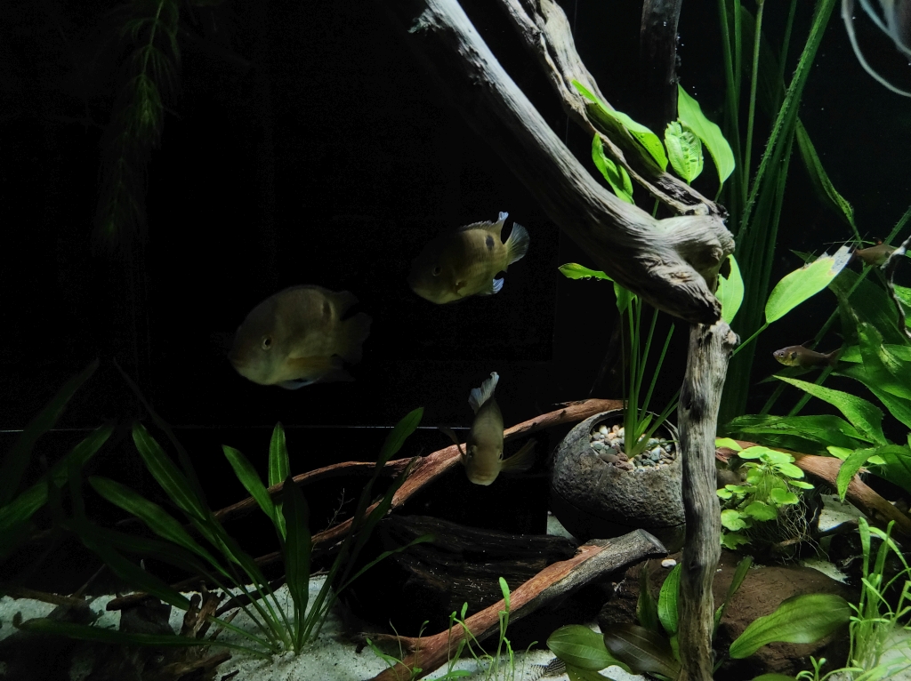 Druga rzecz to taka, że lubię takie klimaty. Na razie nie widać efektu końcowego. Plan jest taki aby żabienice (Echinodorus palaefolius), które rosną w kokosach wyrosły ponad akwarium. Zmagam się z niedoborami różnych składników w wodzie przez co rośliny nie wyglądają tak jak bym chciał. Jakiś czas temu w bardzo dobrej cenie znalazłem Cleithracara maronii, nieco płochliwe choć wydaje się, że towarzystwo Characidae dobrze im robi. Raz położyły nawet ikrę w odciętym denku z kokosa.