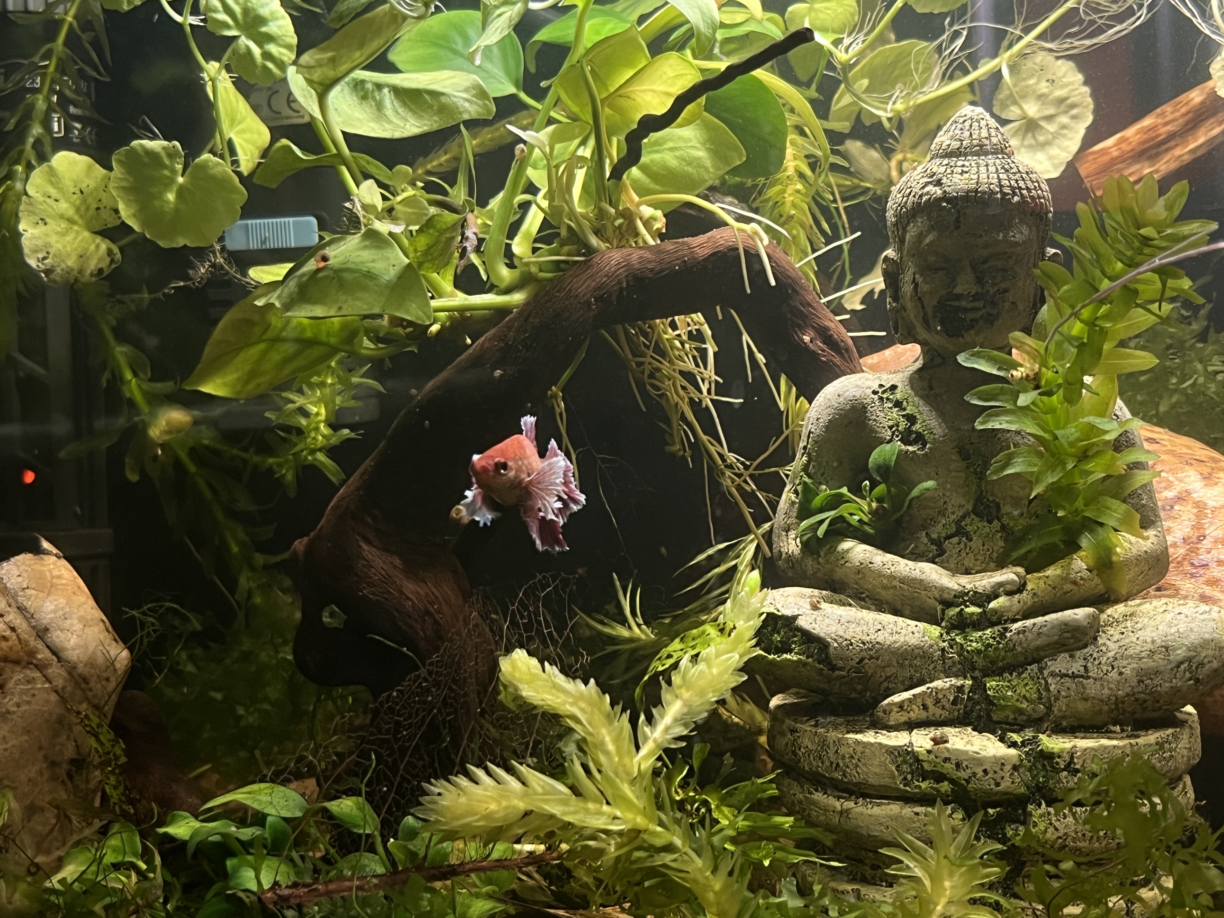 Akwarium wygląda lepiej niż na zdjęciu, jakoś zdjęcia akwariów wychodzą mi słabo (nie wiem dlaczego, bo Wam wychodzą piękne). Sztuczna ozdoba - zwykle nie lubię, ale nie mogłam się powstrzymać. Ogromnie mi się spodobał. Budda jest firmy happet z przeznaczeniem do akwariów. Dodam, że akwarium bardzosię podoba rybce, a to w sumie najważniejsze ;)