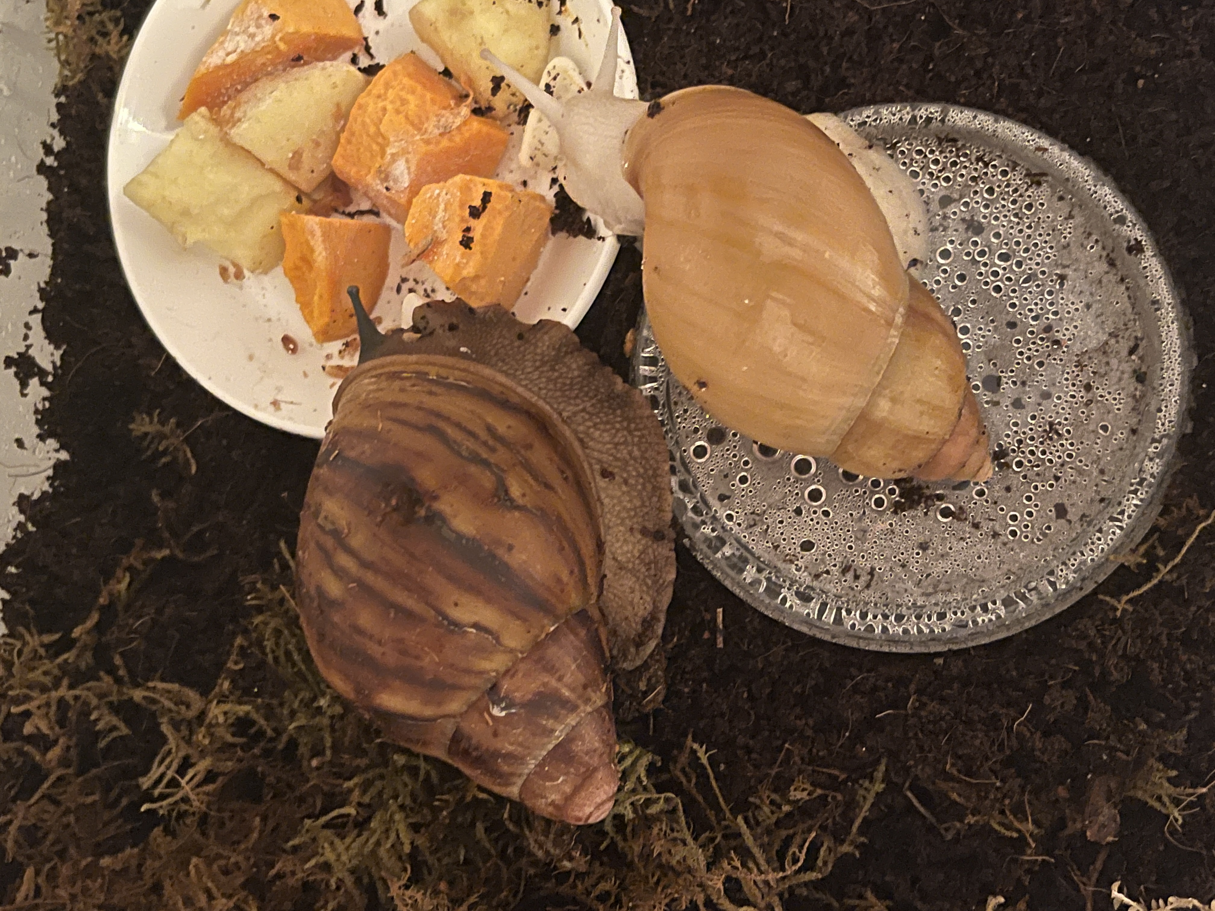 Nowy kolega dla Lissachatina Fulica. Jeszcze trochę wystraszony i szybko chowa się w muszelkę. Oba mają pół roku. Fulica zachwycona. Już drugi dzień śpi mu na głowie