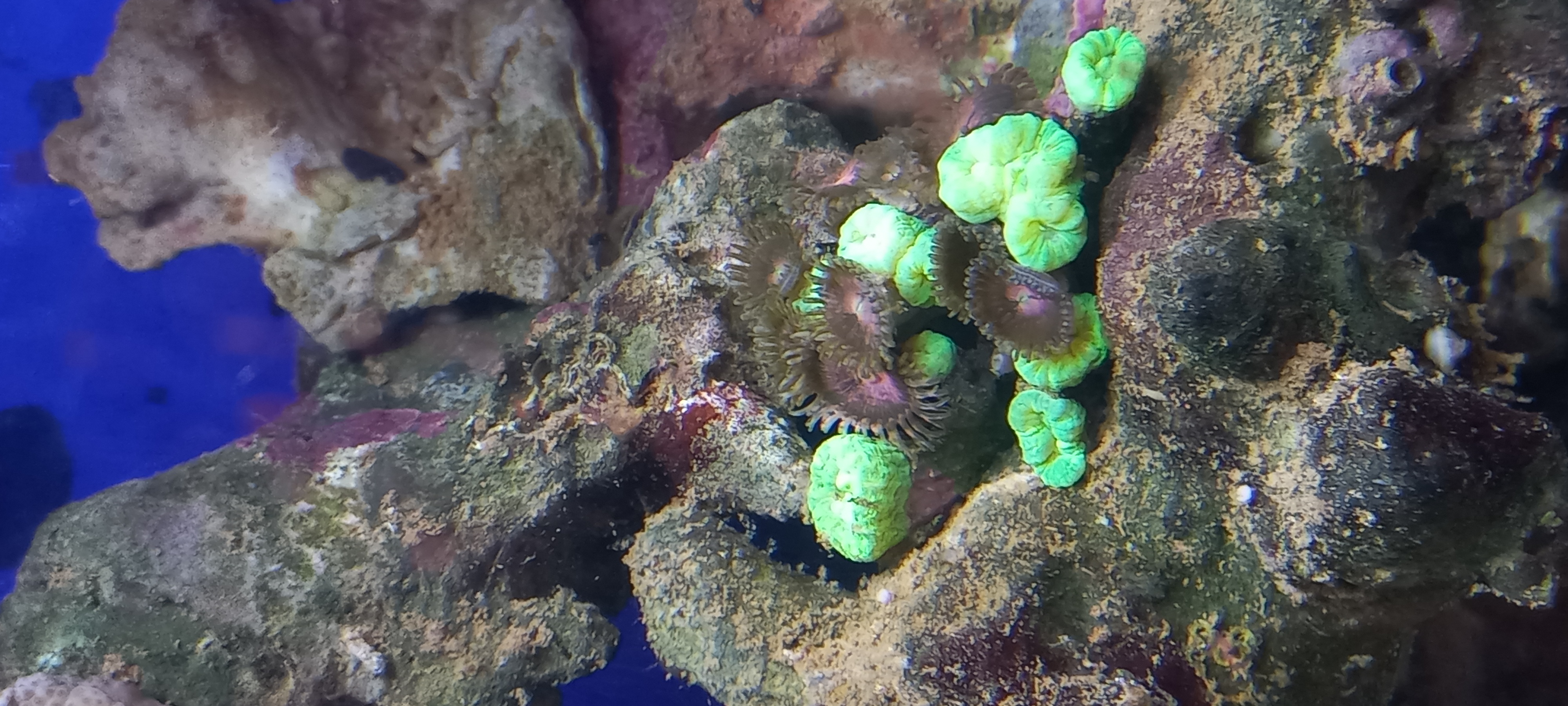 Przepraszam za jakość zdjęcia, która wynika z tego, że robiłem je na ''szybko" telefonem. W zbiorniku pływają: 2 sztuki błazenków (Amphiprion ocellaris), krewetka czyszcząca (Lysmata amboinensis), 2 sztuki krewetki Lysmata kuekenthali oraz 2 sztuki Pteropogona kauderni.