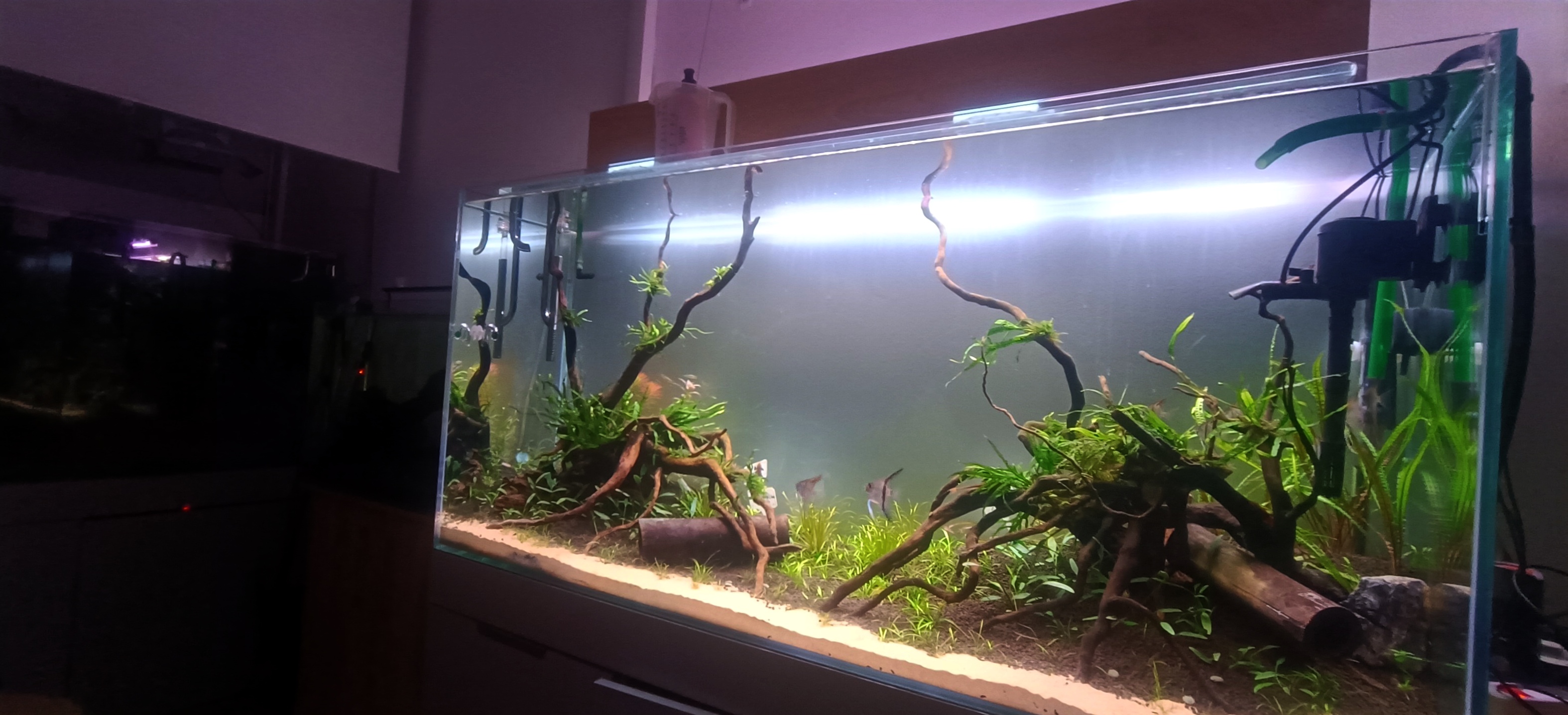 Obecnie w baniaczku żyją żaglowce peru, kirysy Schwartza, kilka kosiarek. Z początku było też kilka krewetek red cherry, ale ... altumiki nie dały im szans.