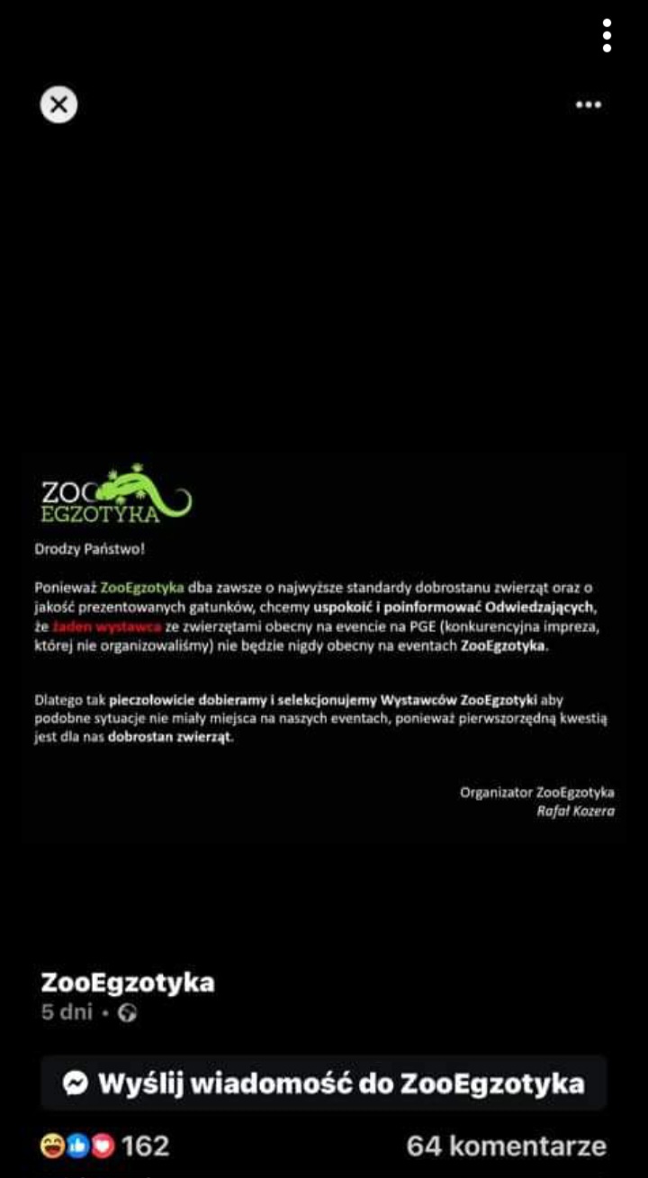 Dodatkowo raport weterynarzy z STP był bardzo negatywny pod kątem kondycji różnych zwierząt i również nie wyobrażam sobie, żeby ZooEgzotyka była kojarzona z takimi Wystawcami. Ponieważ w internecie pojawiało się masakrycznie dużo komentarzy w tym temacie, nie mogę sobie, jako Organizator, pozwolić na obecność podobnych podmiotów na renomowanej imprezie.