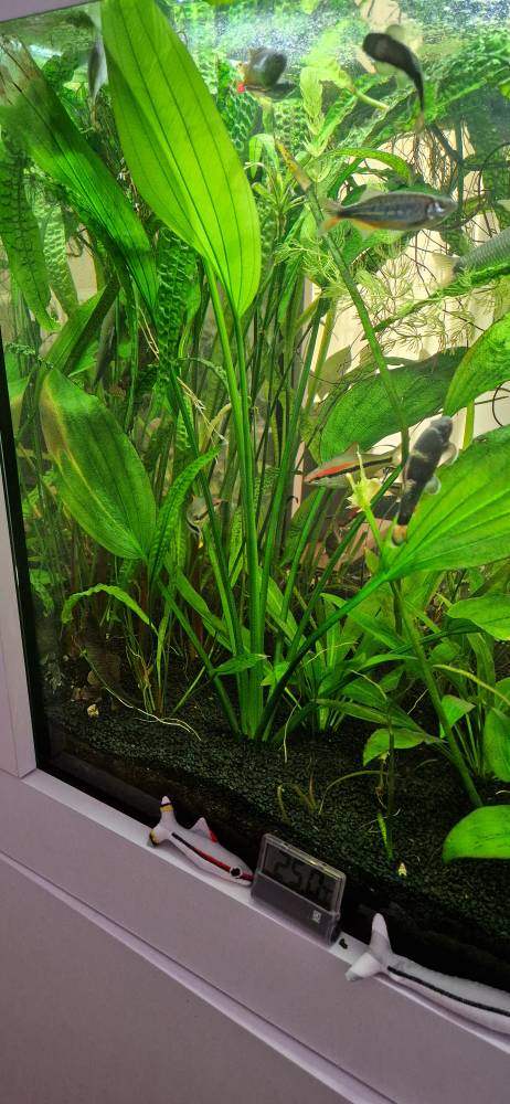 Dawno nie było update. Wróciłem z dłuższych wyjazdow japońskich i muszę przyznać że akwa pozostawione same sobie dało radę. Jedynie lub aż wody wyparowało (akwarium jest otwarte z racji pothosow) za każdym razem z 50l oraz zapylilo szyby (podczas wyjazdów nie było nawożenia potasem jak i mikro). Jedynie automatyczna karma. W sezonie letnim dłużej niż na tydzień bym nie zostawił z racji parowania i temperatury. Ktoś dolewkę musi robić:)