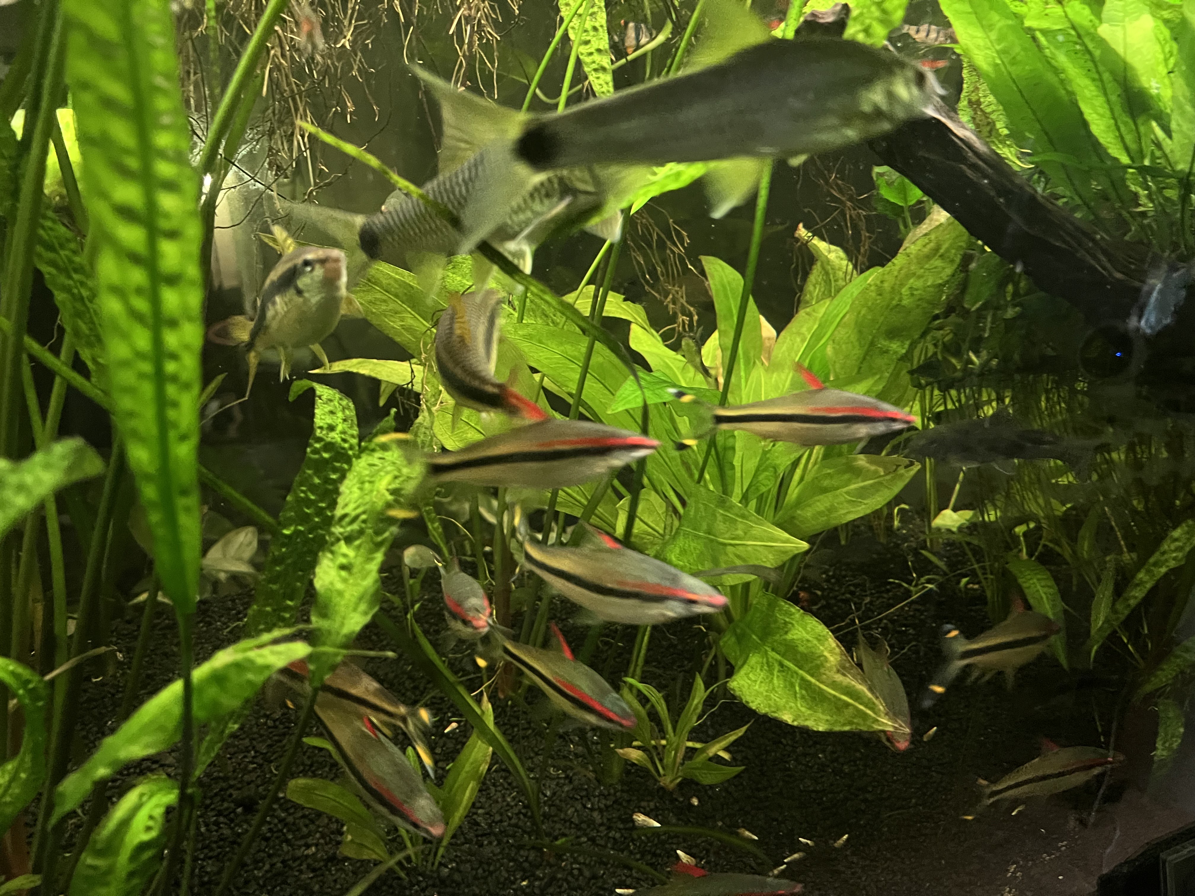 12) Kardynałki chinskie - weterani, z 5 sztuk, od narybka w akwa więc min. 2 lata Tylko te przetrwały temp wody około 25stopni.
