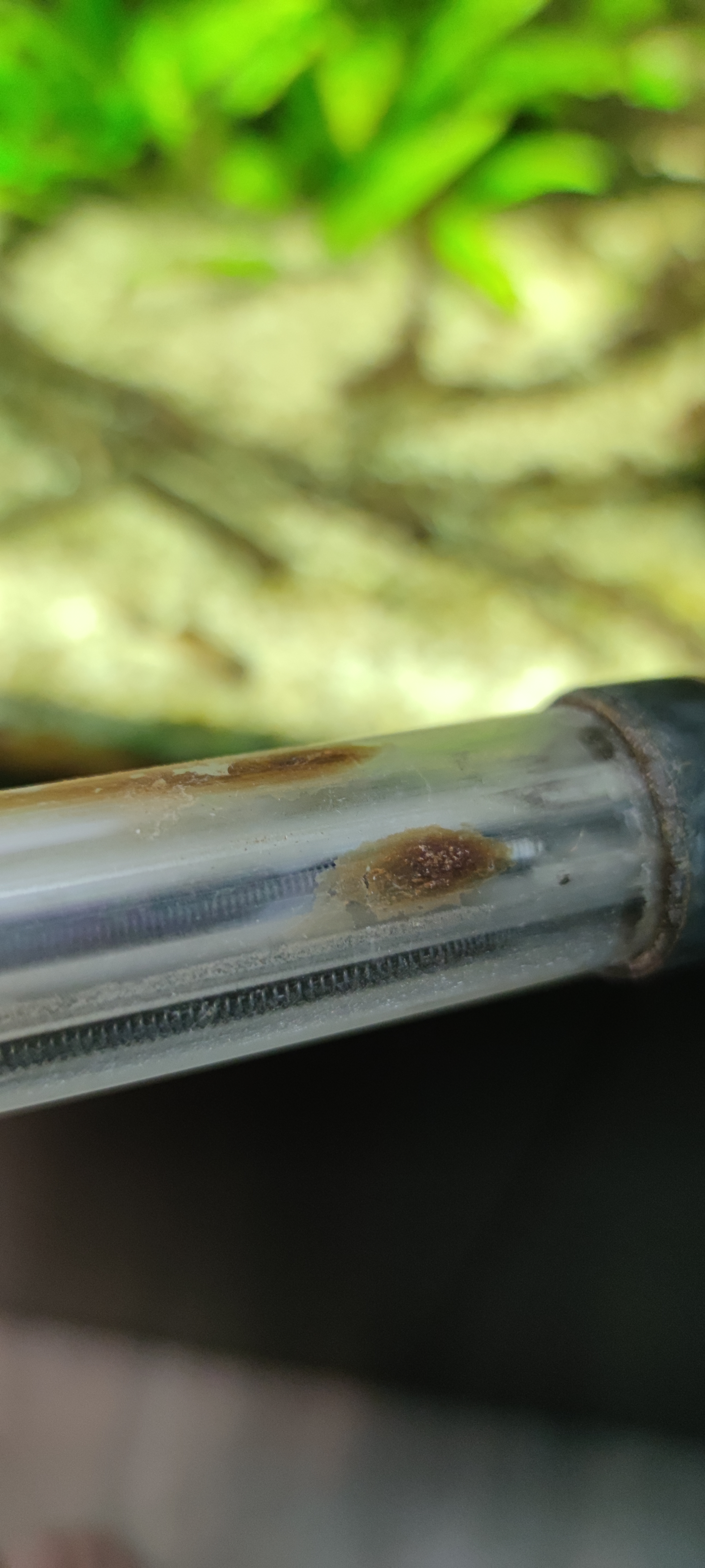 Mam mały problem z moją grzałką AquaEl 300W GOLD. Na szkle zaczęły się robić brązowe naloty, tak jak by się szkło zaczynało przypalać. W jednym miejscu ten nalot jest nawet chropowata, jak by zaczęło coś się dziać z szkłem. Do tego na górnej części grzałki zeszło malowanie. Czy to znaczy, że z grzałką dzieje się coś nie tak, czy wszystko jest ok i nie ma się co przejmować?