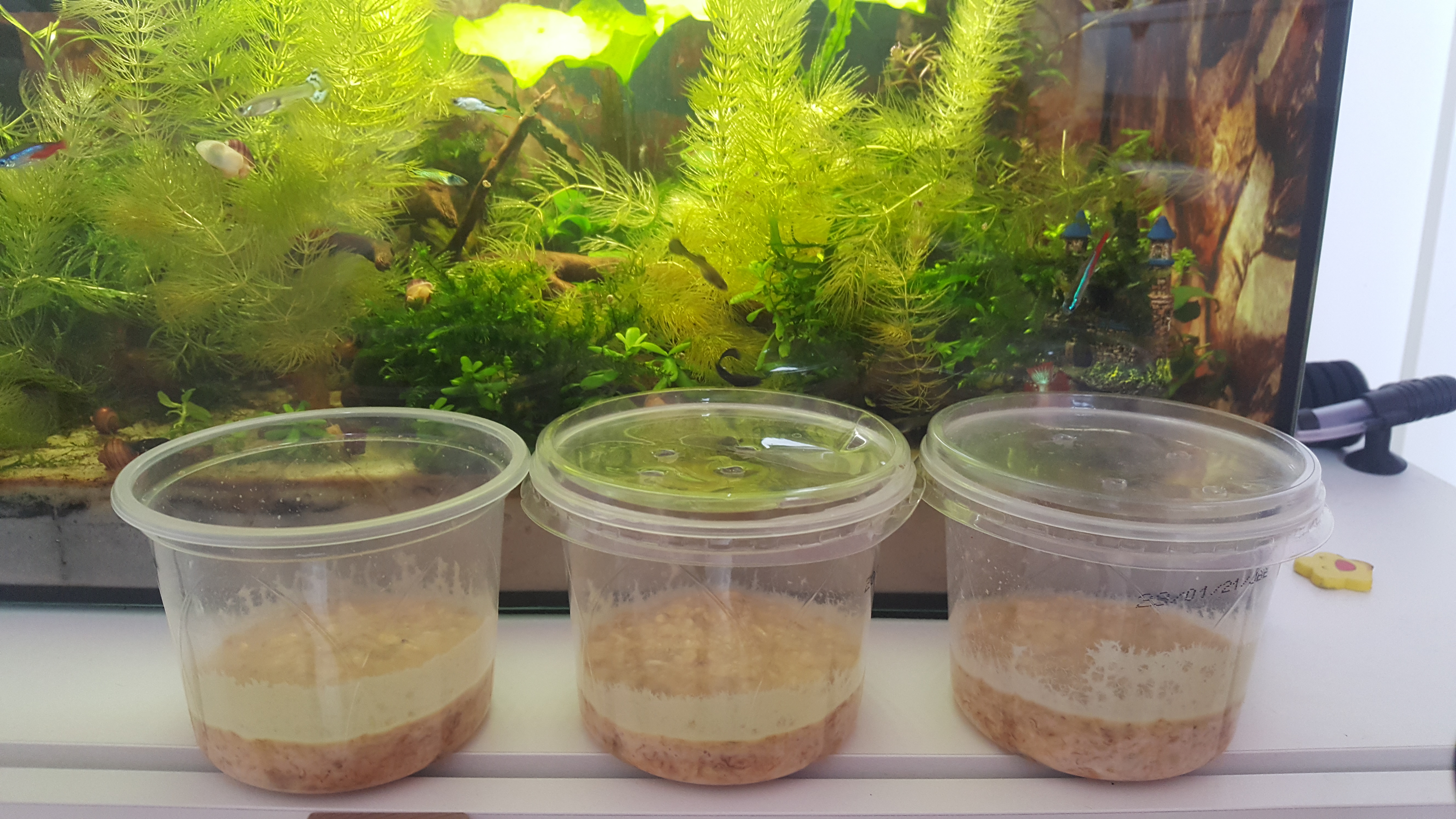 Płatki trzeba sparzyć wrzątkiem. Po ostygnięciu dodajemy do nich 1/3 kostki drożdży i kawałek banana. Wszystko ugniatamy na papę. Do pudełka wkładamy porcję zawodową i łyżkę lub kilka papki. W wieczku pudełka należy zrobić dziury. Jeśli w domu są muszki owocówki to dodatkowo trzeba zabezpieczyć dziury watą,bo inaczej muszki będą zainteresowane. Mieszamy i już. Za 2-3 dni na ściankach naczynia powinno być na tyle robali,żeby ryby były hepi. Robale ze ścianki zdejmuję patyczkiem do uszu. Łatwy żywy pokarm,który cieszy zarówno narybek jak i dorosłe ryby i krewetki.