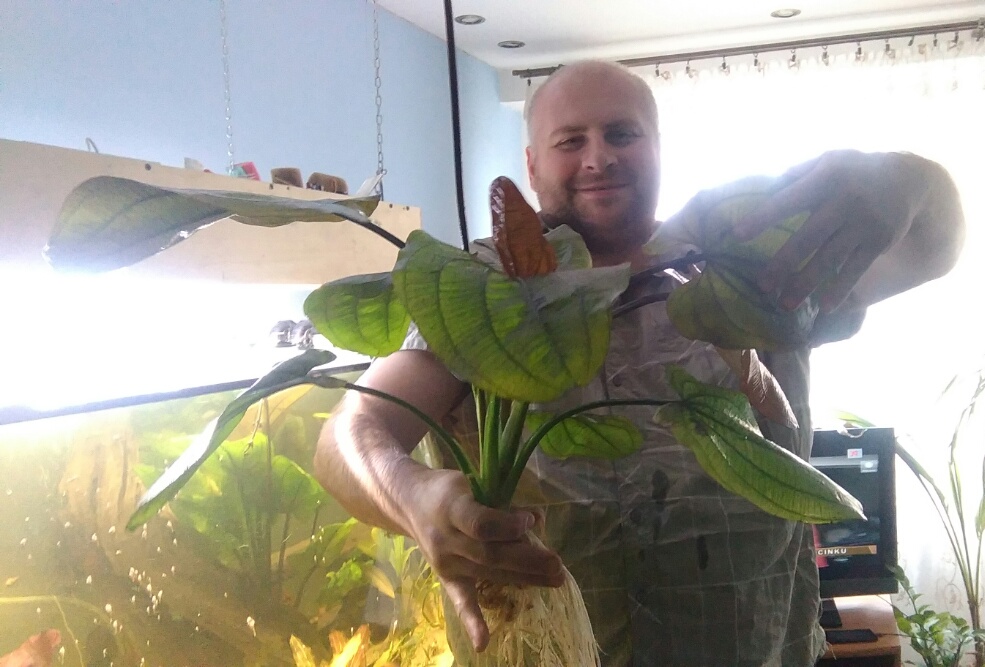 Niestety na jednym ze zdjęć mija brzydka facjata - zdjęcie z wysyłki rośliny, ja jako porównanie wielkości rośliny. Lotosy miałem duże - ale ten echinodorus przerósł wszystkie moje rośliny akwariowe jakie miałem. Na piachu, tym złym.