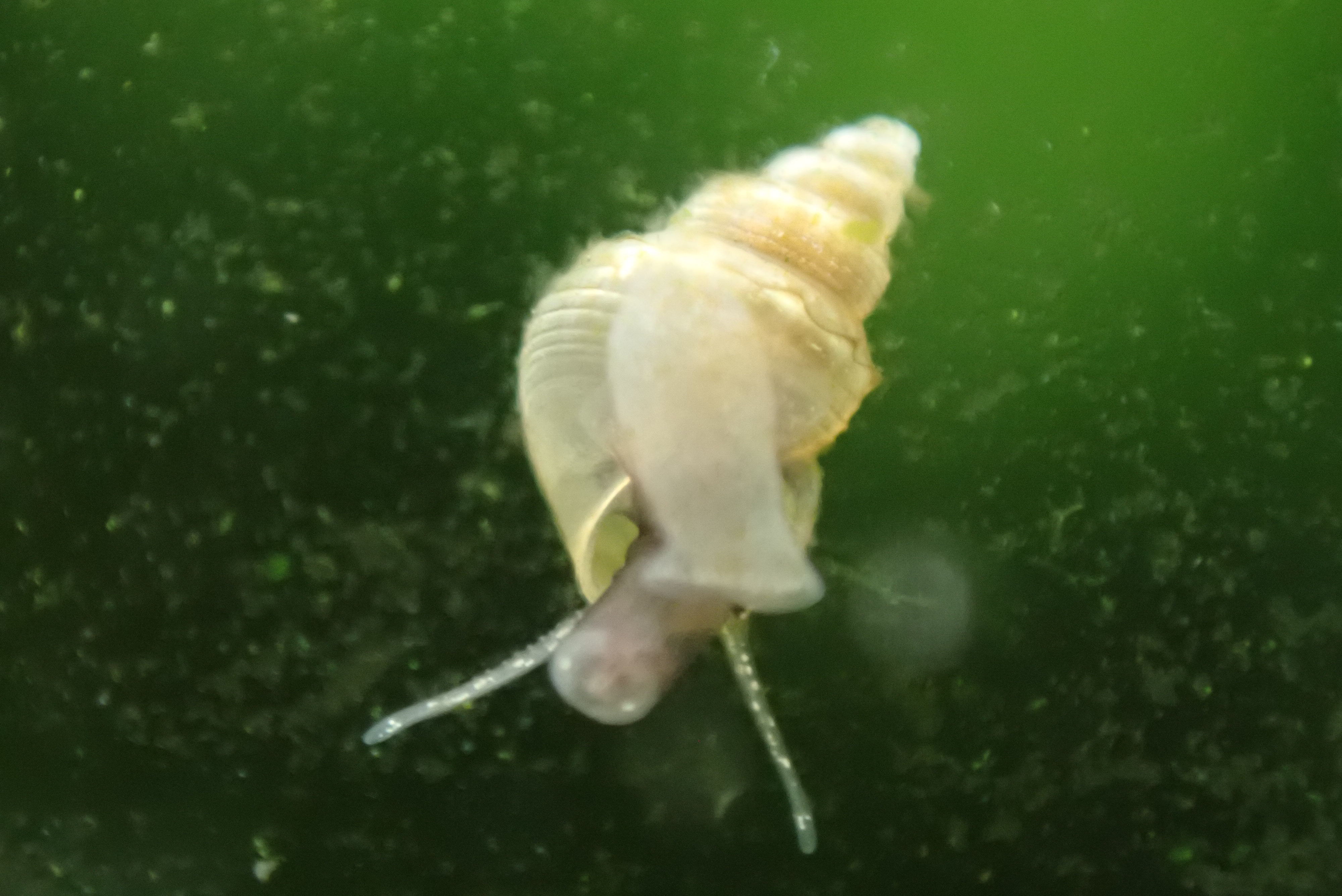 Ten sam ślimak en face ;) chyba je tą trąbką glony z szyby. Widzę teraz, że jest za gładki na Helenkę. I dorasta tylko do kilku milimetrów.