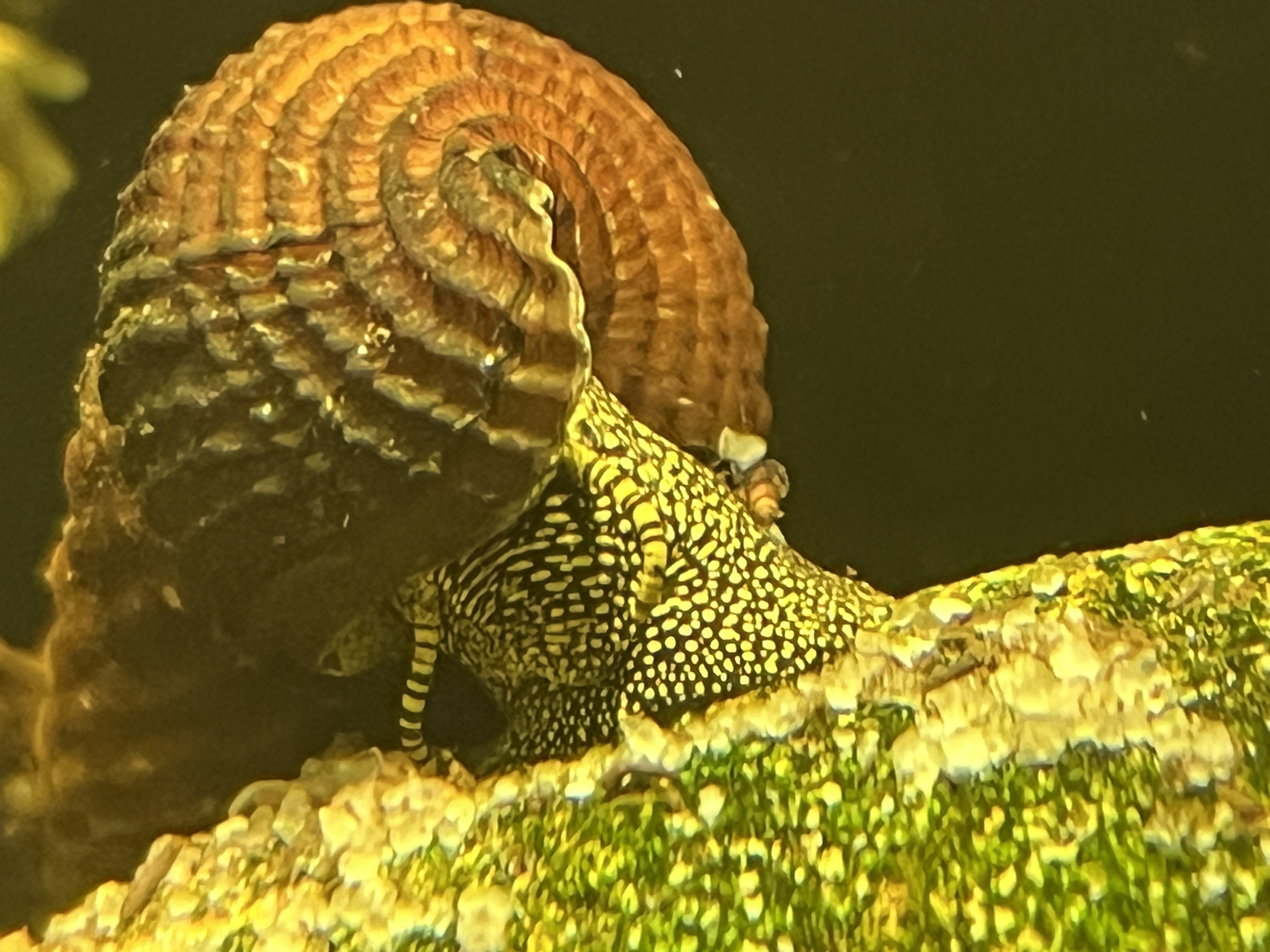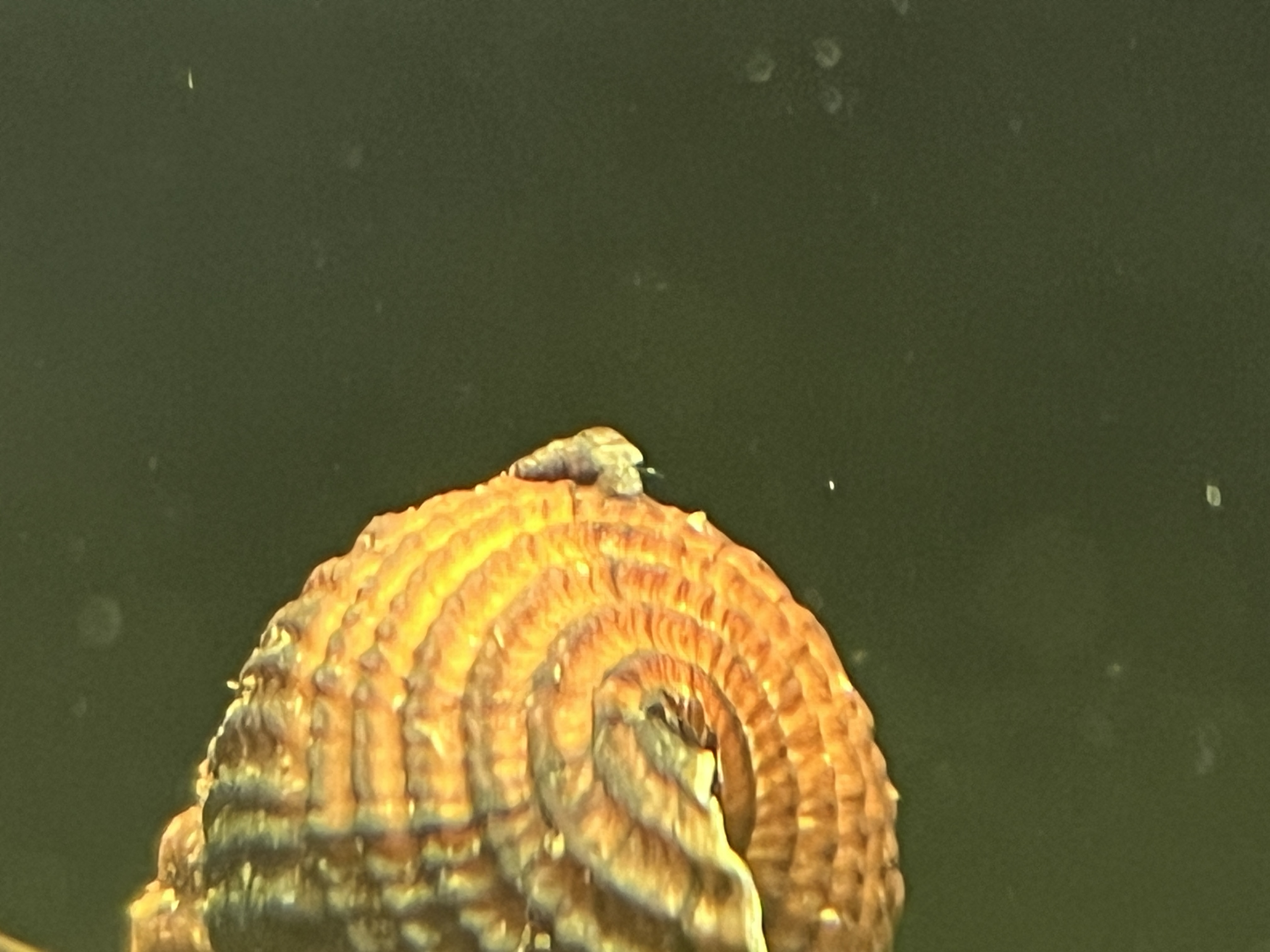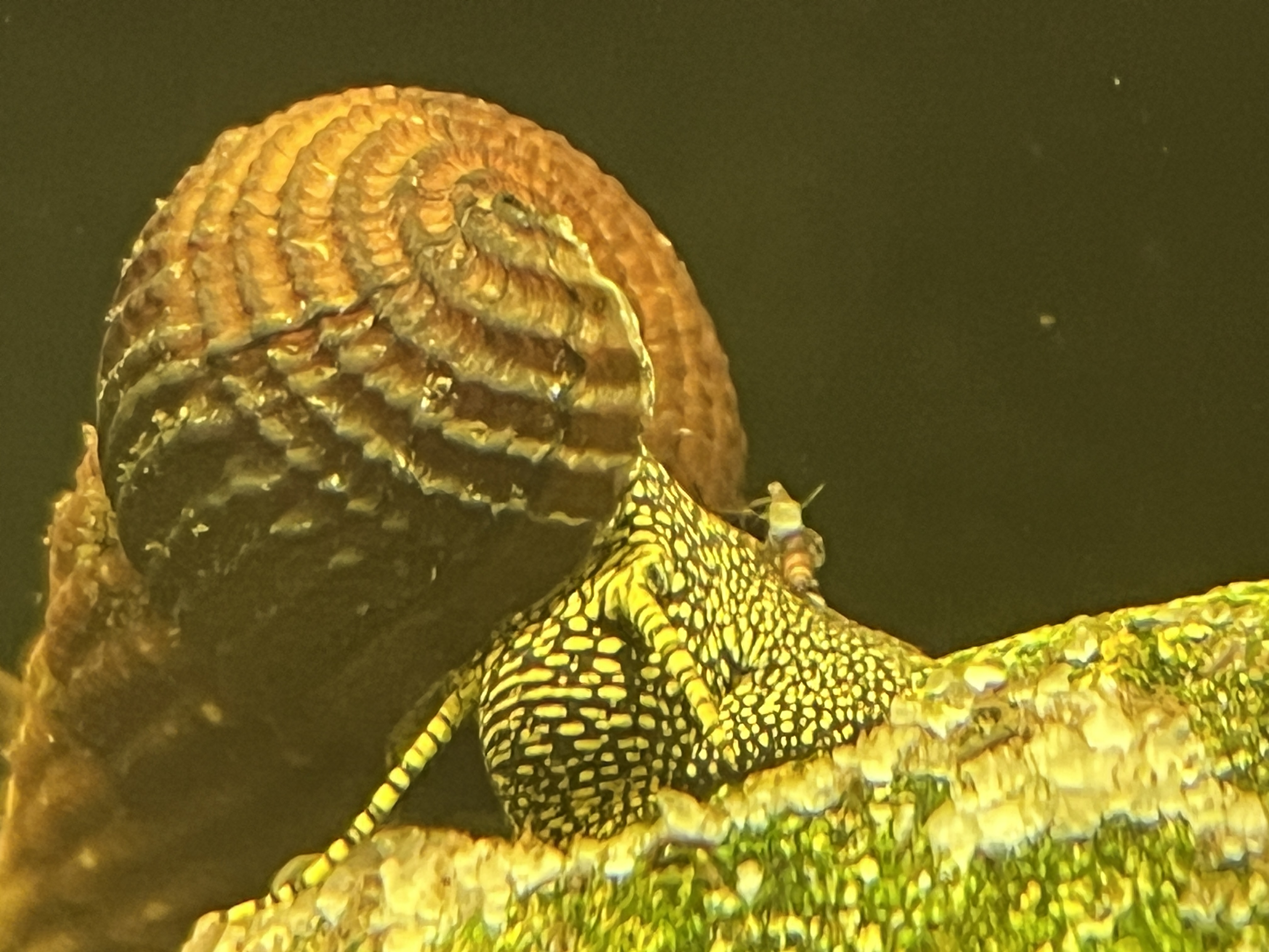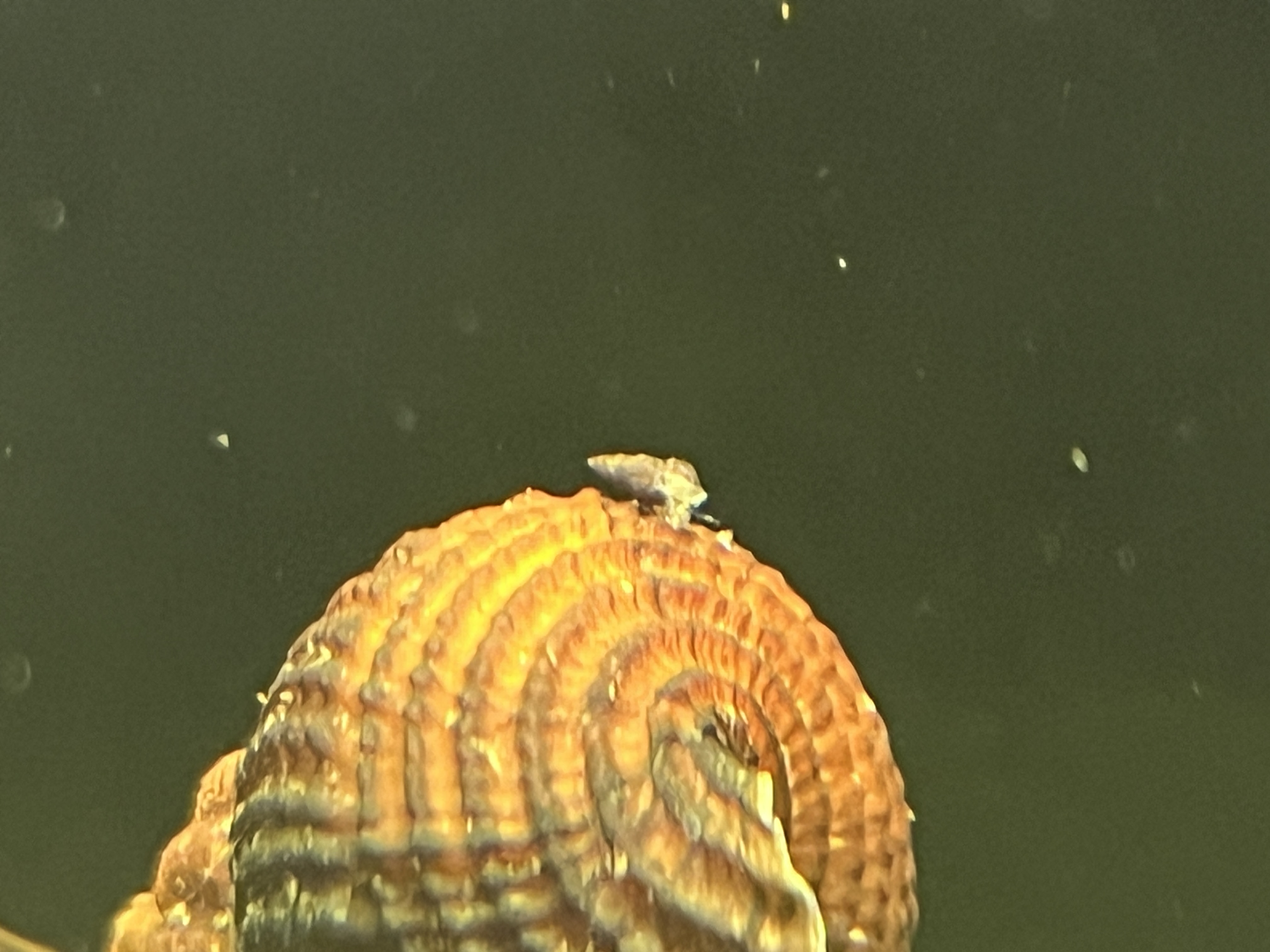 Ślimakowi chyba spodobało się nowe akwarium, bo dzisiaj znalazłam młode. Jest maleńkie. Siedziało na matce (może akurat urodziła). Na zdjęciu słabo to widać, ale mały to kolorystyczna kopia dużego.
