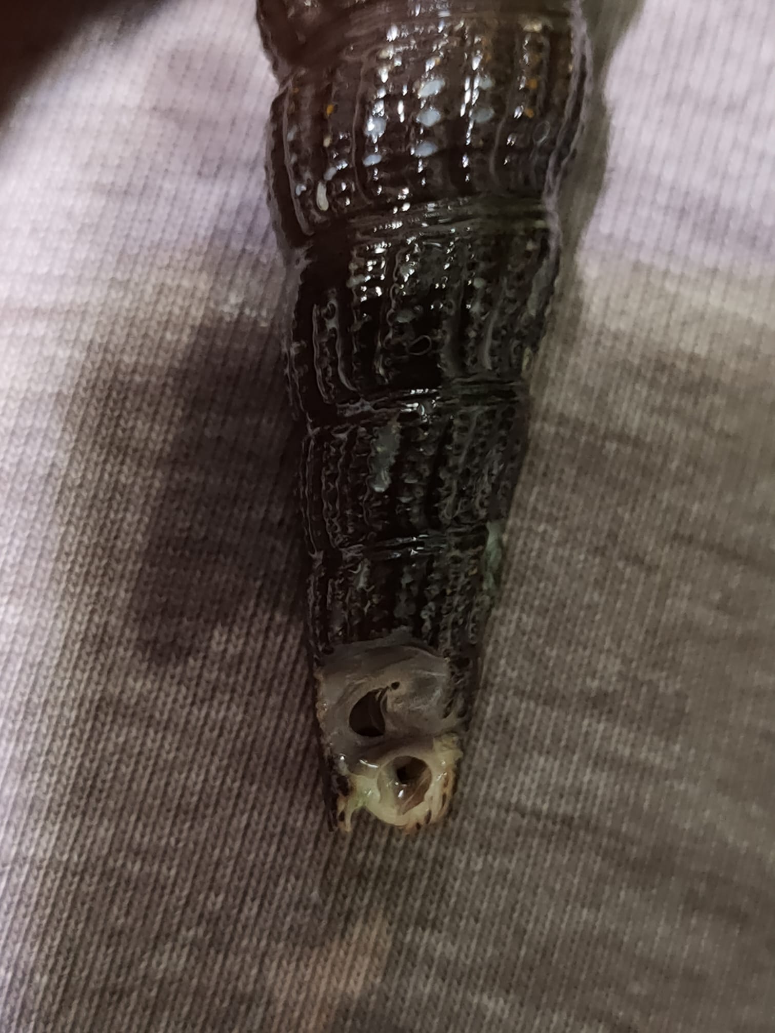Na zdjęciu tylomelanii wygląda to raczej na uraz mechaniczny, obtłuczone w transporcie, u helmeta pewnie też, chociaż słabo widać. Erozja spowodowana parametrami wody/dietą obejmuje większą powierzchnię muszli, nie tylko jej koniec, muszla robi się miejscami biała.