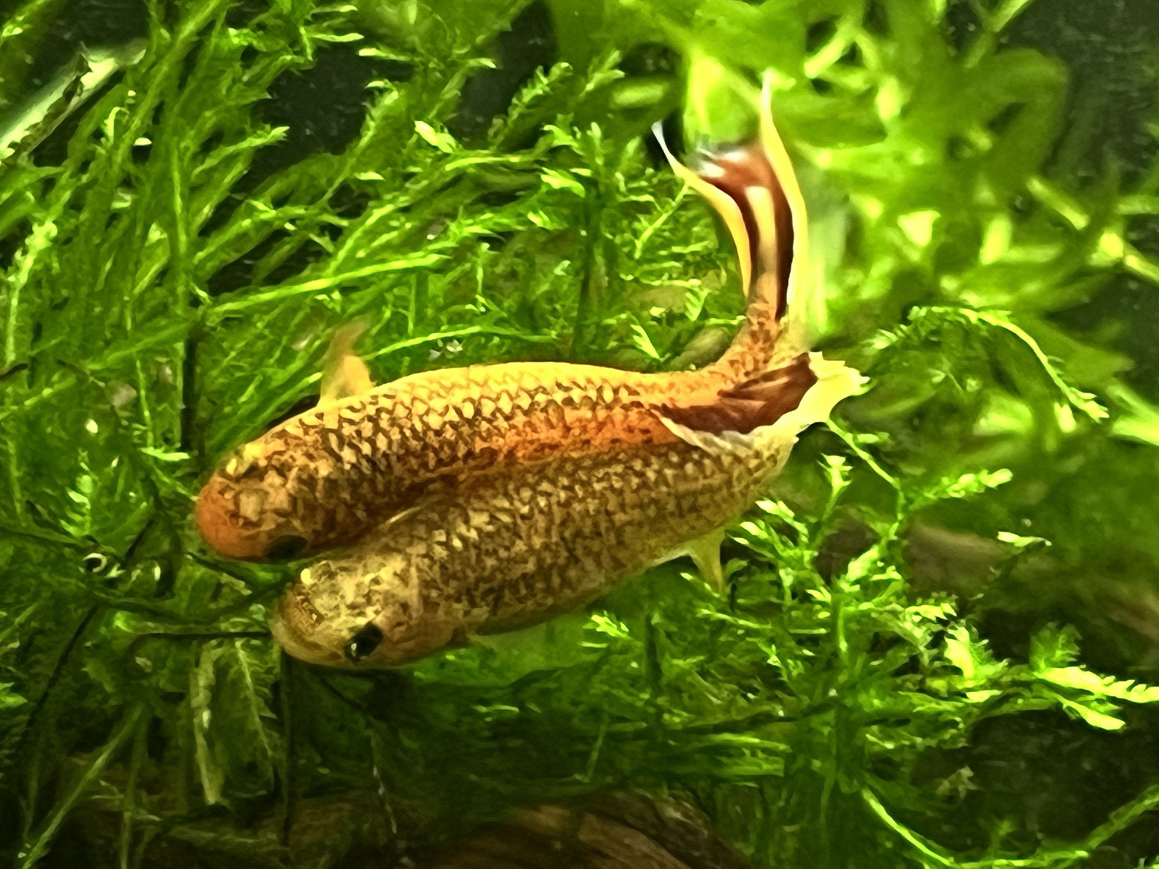 Szczupieńczyki nie boją się większych ryb, siadają im na nosie, a Proporczykowce chyba nie chcą ich zjeść. Podczas wspólnego jedzenia. Wszystkie ryby jedzą również suchy pokarm, jak się okazało. Poniżej krewetka jakby rili (to rili?).