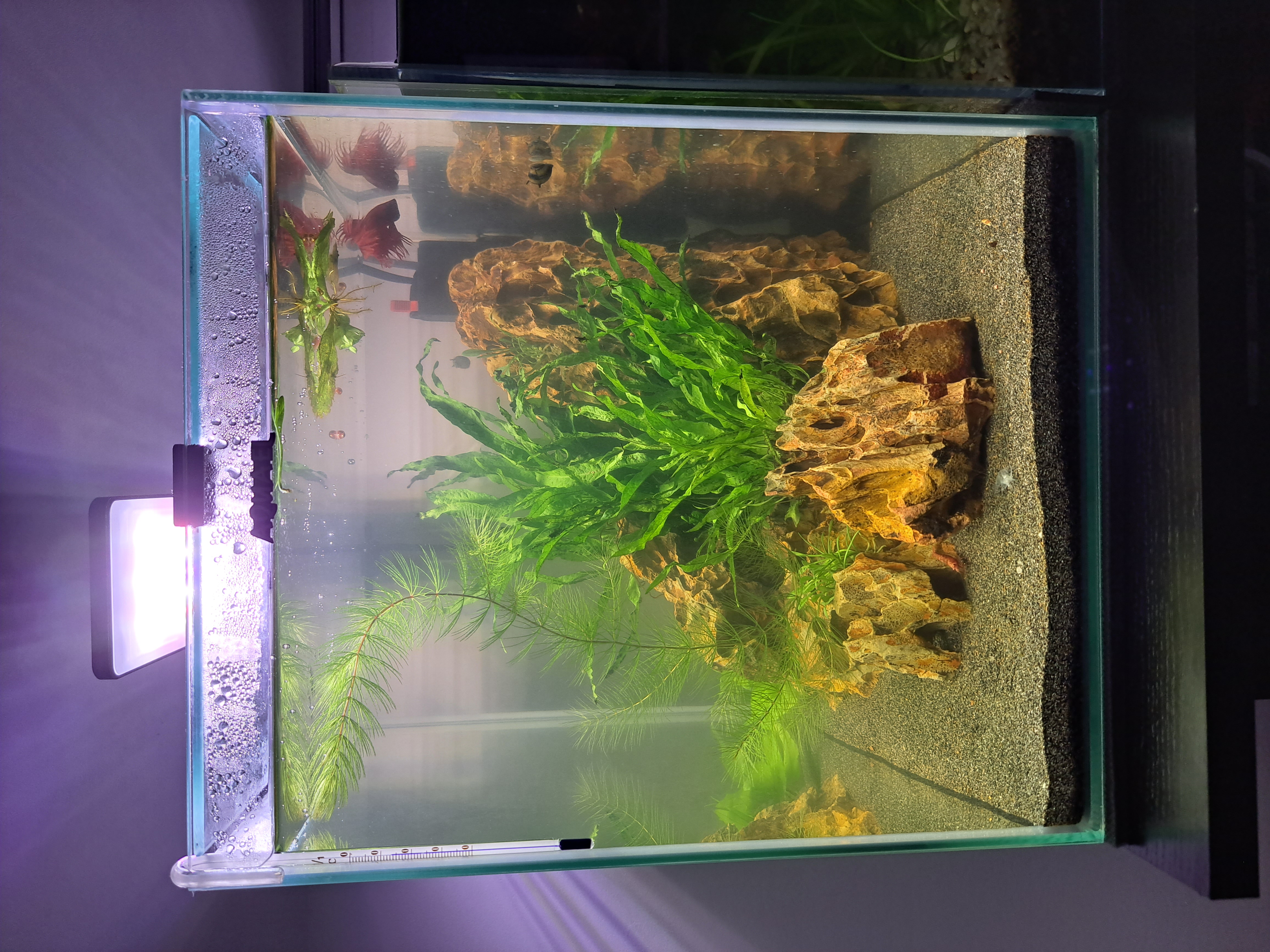Od trzech tygodni borykam się z mętną wodą i zupełnie nie wiem co mam zrobić. W między czasie obok pojawiło się podobne akwarium, też bez filtra ale z innym wystrojem. W podobnym czasie po starcie też woda zaczęła być mętna. Włożyłem testowo filtr do środka i po 2 dniach woda kryształ. W pierwszym akwarium tego nie chcę robić z uwagi na bojka.
