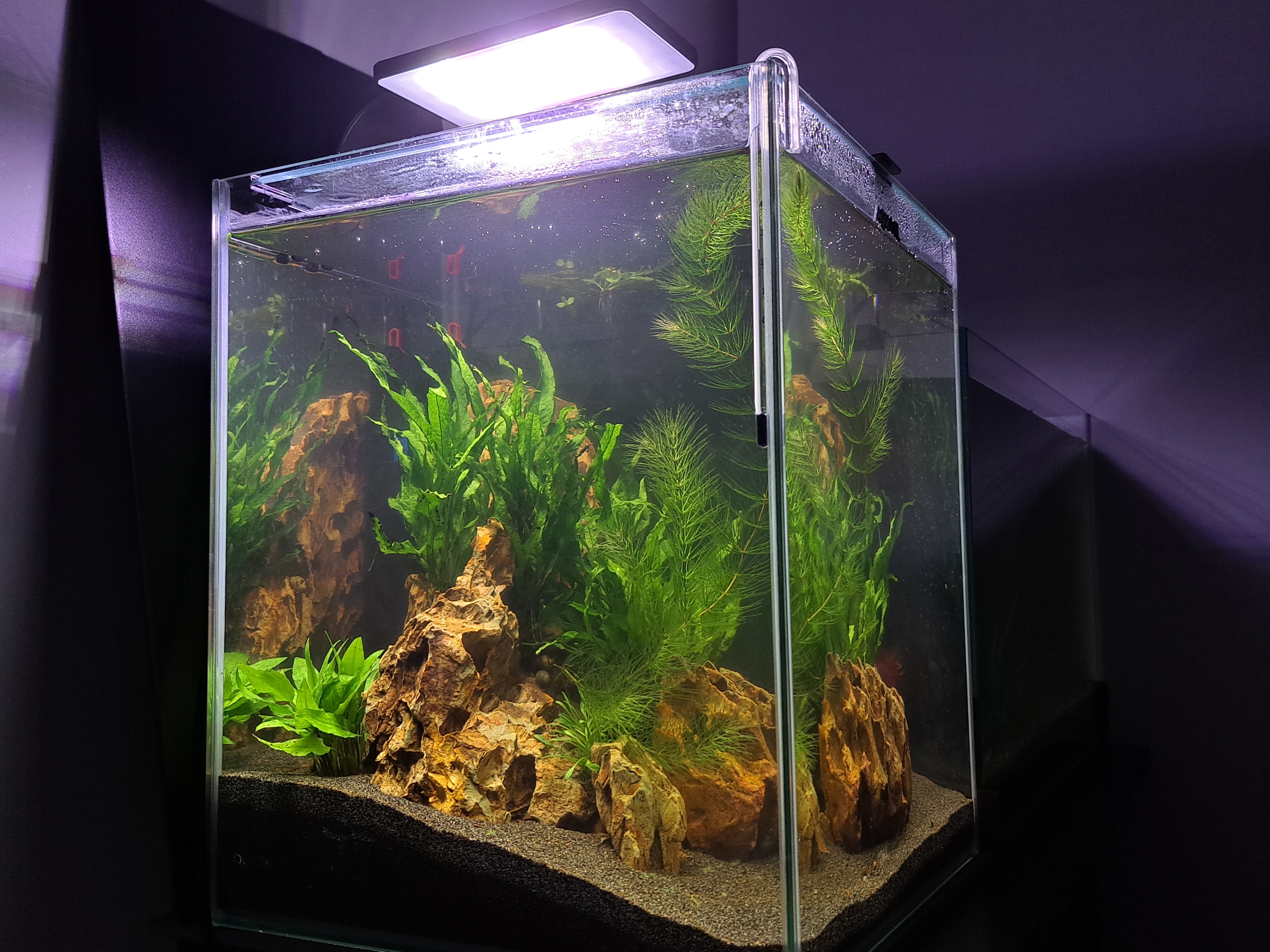 Akwarium pochodzi z zestawu ShrimpSet 30, czyli szkło o wymiarach 29x29x35cm z szybą nakrywową. Za słońce robi lampka Aquael Leddy Smart 6W Plant a całość ogrzewa grzałka Fluval E 50W (27 stopni). Filtra jakiegokolwiek brak.