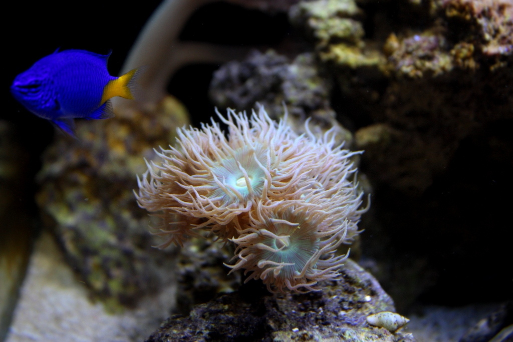 Poniżej zdjęcia na 2 dni po założeniu (pierwsza fotka - tylko belka LED, druga - kombinacje z T5 - ze starymi świetlówkami nie-morskimi): - a tak to się prezentowało na regale nad innym akwarium - azjatyckim strumieniem (szykuje się fajny kontrast dwóch światów