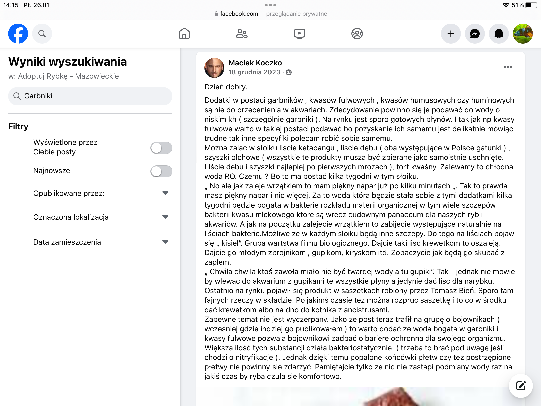 Edit: zadałam pytanie o garbniki (gdzie najwiecej)w poście na grupie fb Maćkowi Koczko. Jeśli odpisze to dam znać. On też pisał, żeby garbniki używać w wodzie o niskim kH. https://www.facebook.com/groups/6000221 ... q=Garbniki