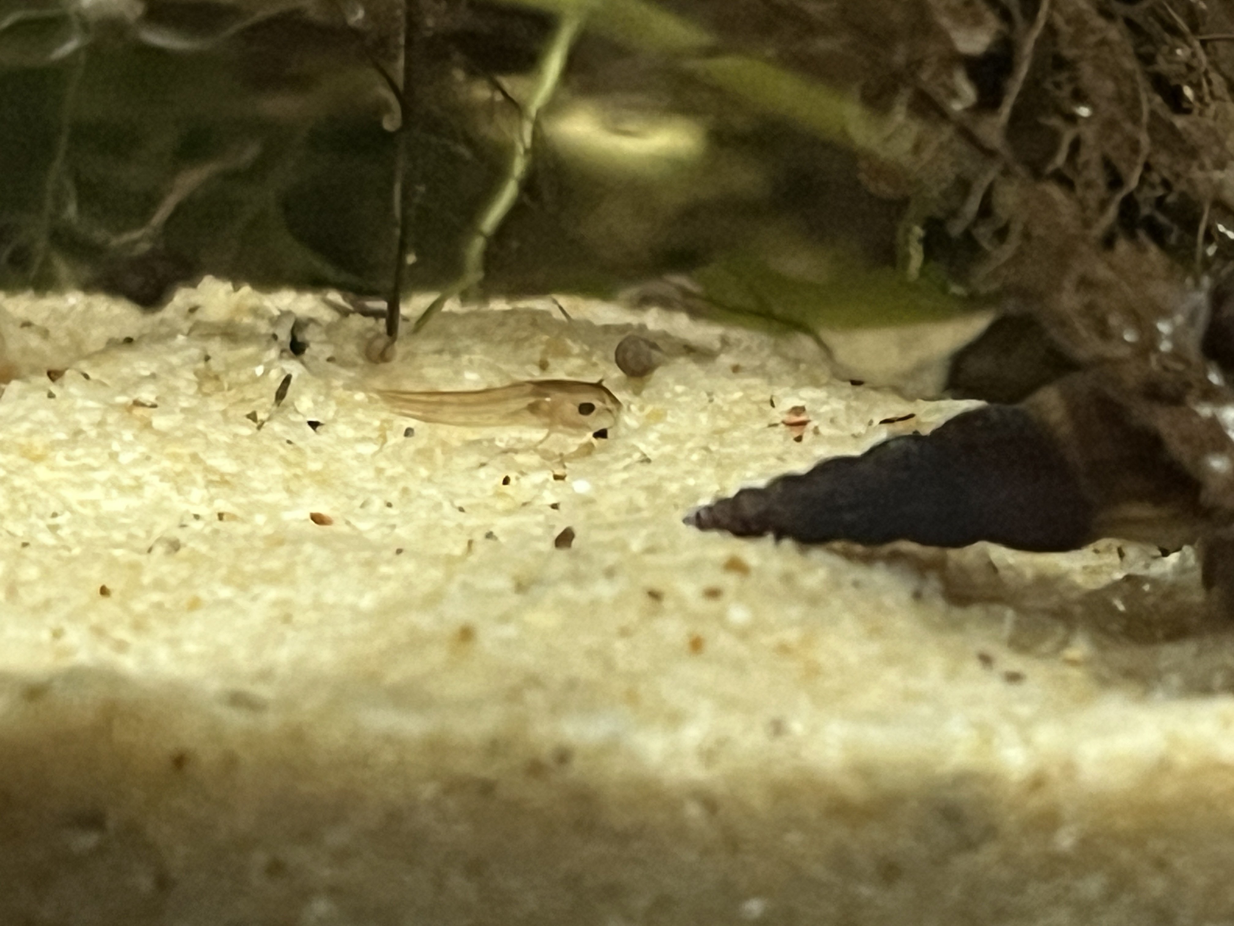 Jeden urósł. Widzę jeszcze takie pojedyncze średnie, ale niestety nie wszystkie przeżywają. Chyba nic ich nie zjada, więc nie wiem dlaczego. Sypię pokarm mikro i non stop wykluwam artemię dla tych, które są już wystarczająco duże żeby ją zjeść.