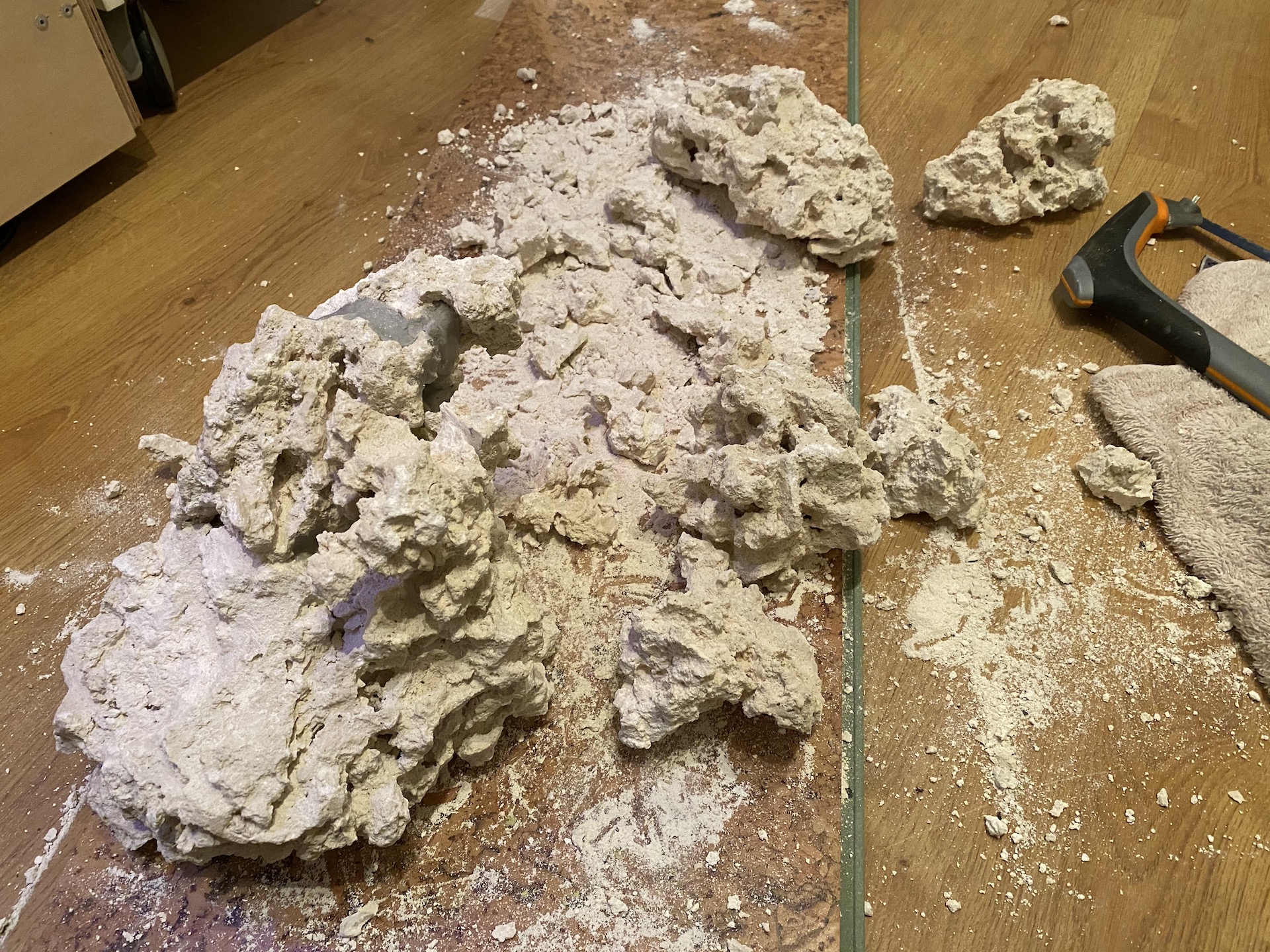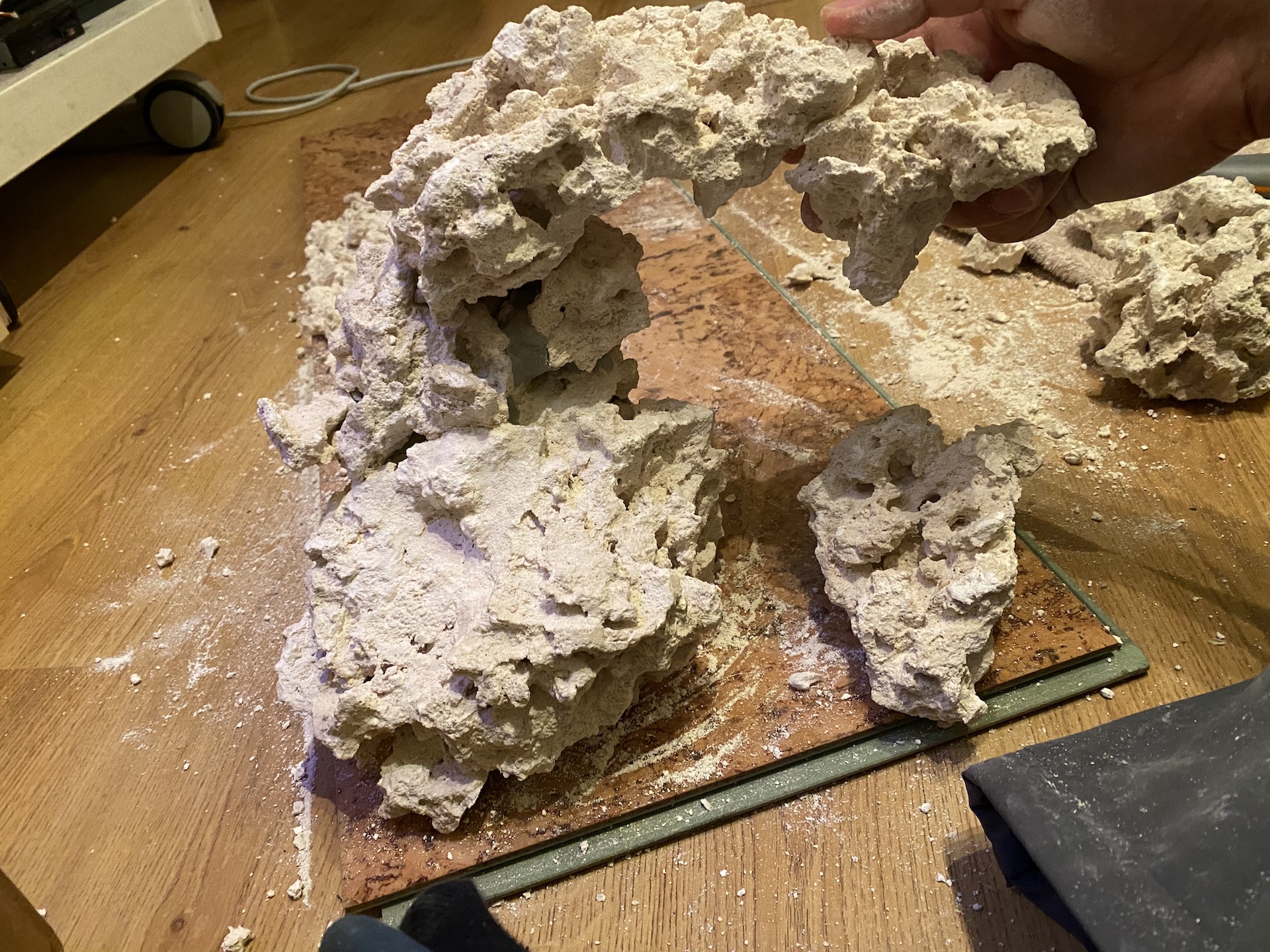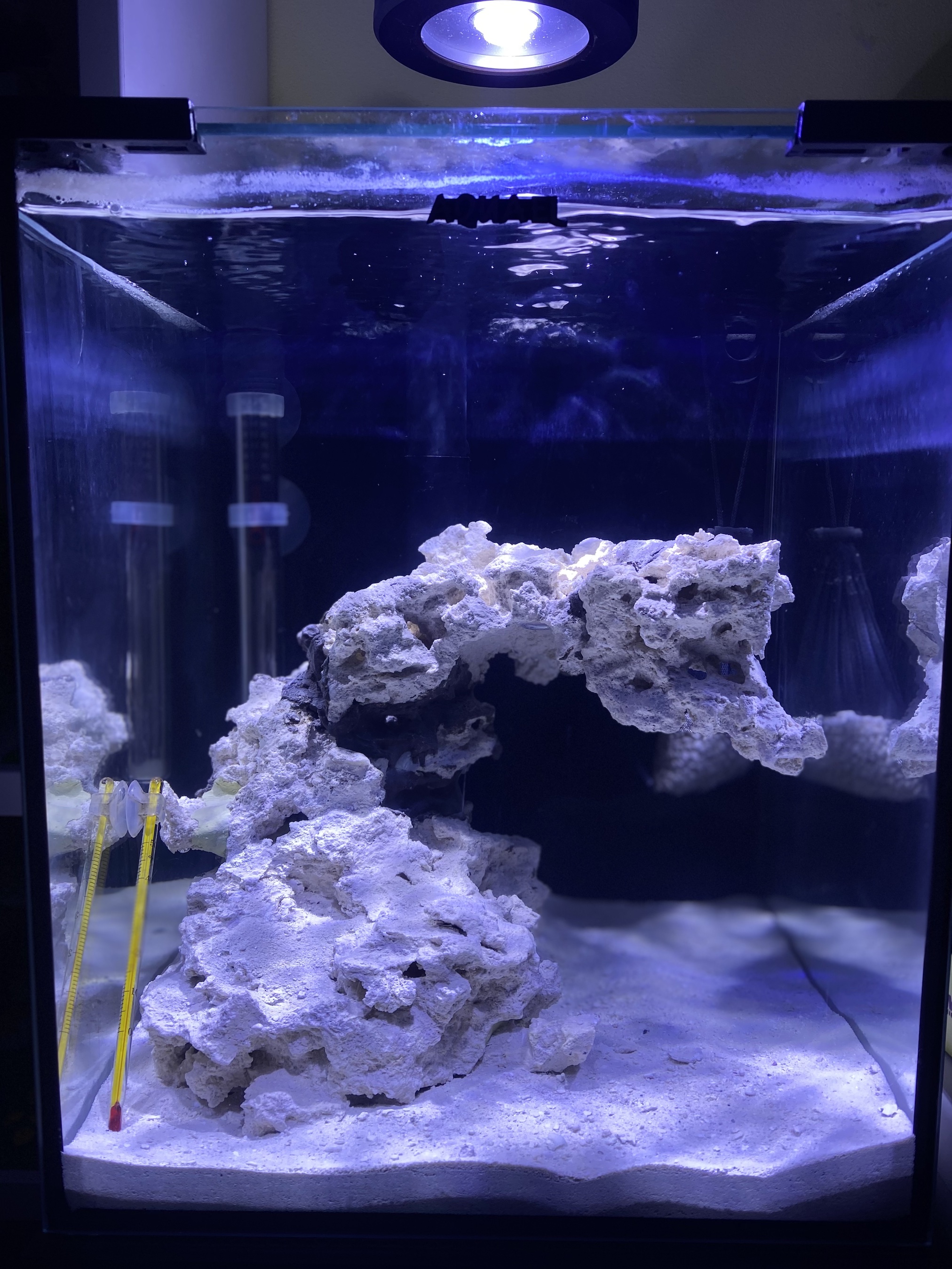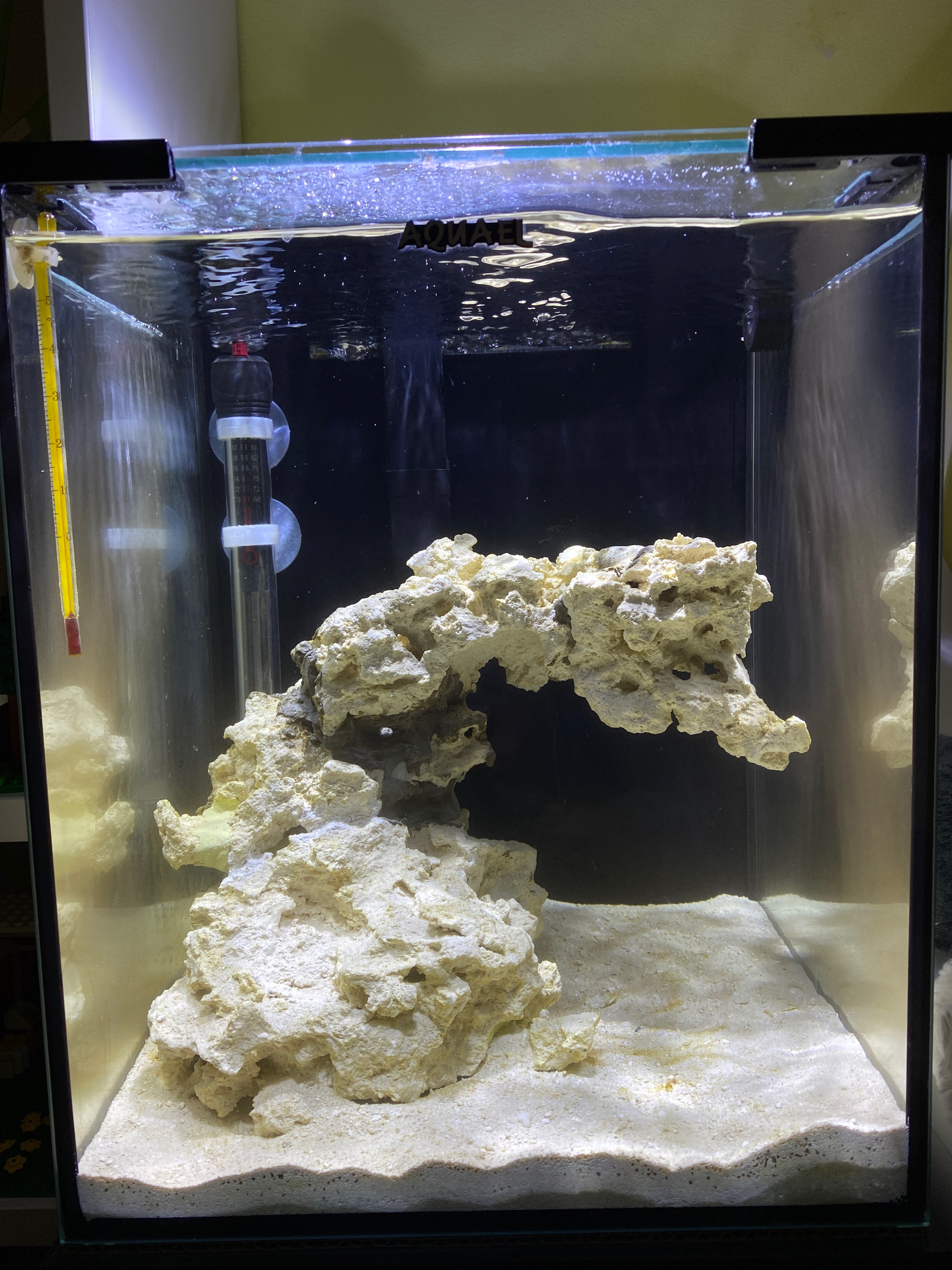 @Limak86, tak łuk jest tylko na skale (całość składa się z 5 kawałków „bazowych”). Po rozłupaniu „kamulca” akurat wyszedł mi jeden kawałek o płaskiej podstawie i na nim zbudowałem resztę. Jest o tyle fajnie, że jest kilka płaskich powierzchni na których będzie można ustawić korale. Co do plag to czekam cały czas cierpliwie :) . Może być różnie, bo w końcu użyłem żywej wody + bakterie + żywy piach. Choć muszę przyznać, że widzę kilka ognisk wielkości 2zł na piasku takiego jakby brązowego (chociaż ja daltonista więc to może nie być brązowy :) )nalotu/pyłku. Parametrów jak dotąd nie mierzyłem.