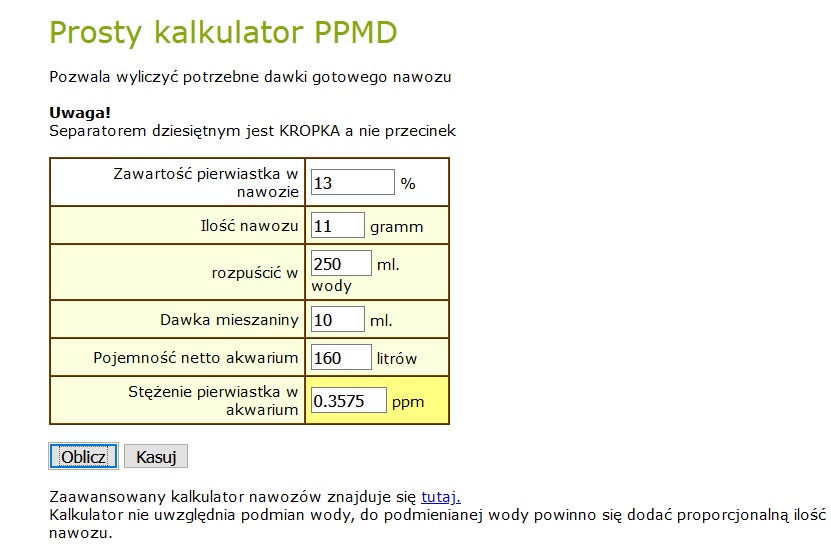 Kalkulator z http://palabras.pl/#/kalkulator należy uzupełnić pod to co wyjdzie z testów – jeśli z testów wyjdzie że np. NO3 jest na poziomie 30 ppm to należy pominąć nawożenie tą solą. Litraż akwarium – to wartość netto – np. akwarium 200l brutto będzie miało realnie 160 netto. Do policzenia wartości netto akwarium można użyć tego kalkulatora: https://az-led.pl/kalkulator-zbiornik/?cookie=yes