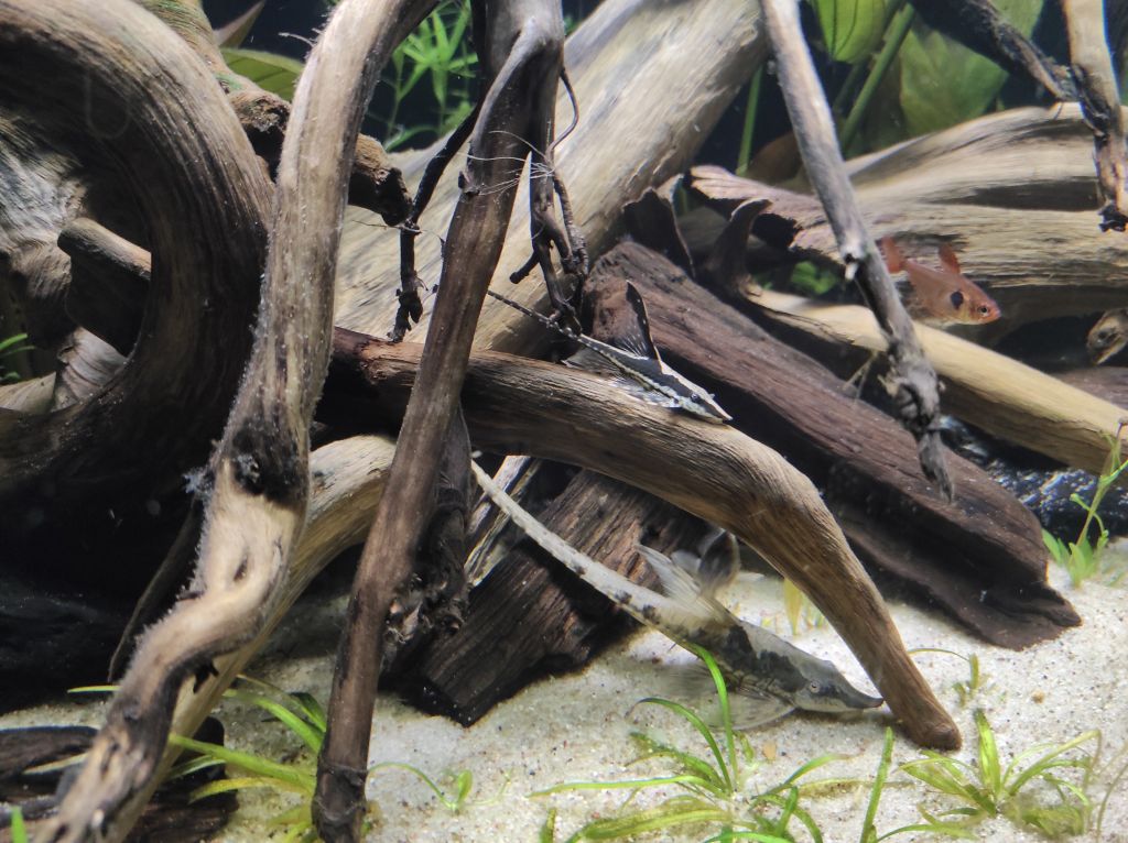 Ciekawa sprawa z nimi jest. W poprzednim akwarium na początku były dość widoczne. Następnie się coś zmieniło i większość dni siedziały schowane w roślinach. Teraz też ich jeszcze nie widać. Zazwyczaj wypływają pod wieczór w momencie gdy lampa powoli zaczyna gasnąć.