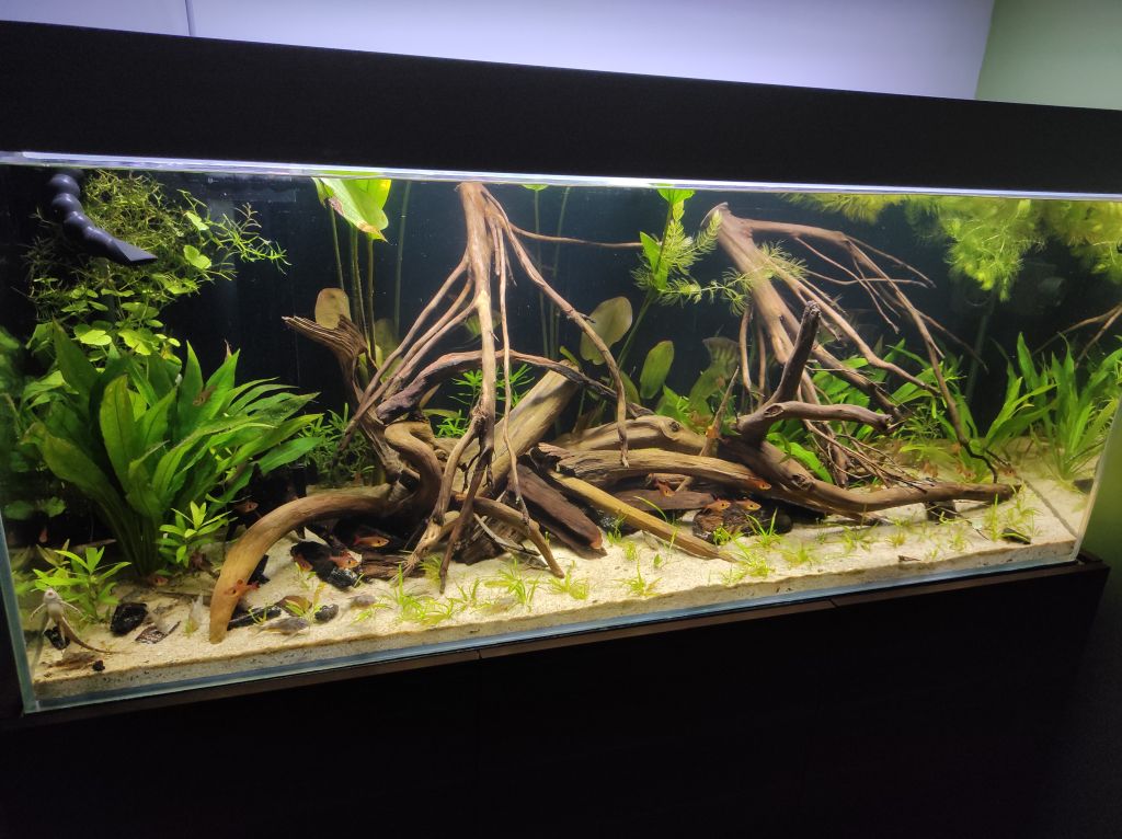 Co do aranżacji to mi się podoba, ale dałbym jakiś jeden korzeń (nie musi być szczególnie duży) ale taki żeby sięgał tafli. To by przełamało troszkę poziome linie jakie widzę patrząc na to akwarium.