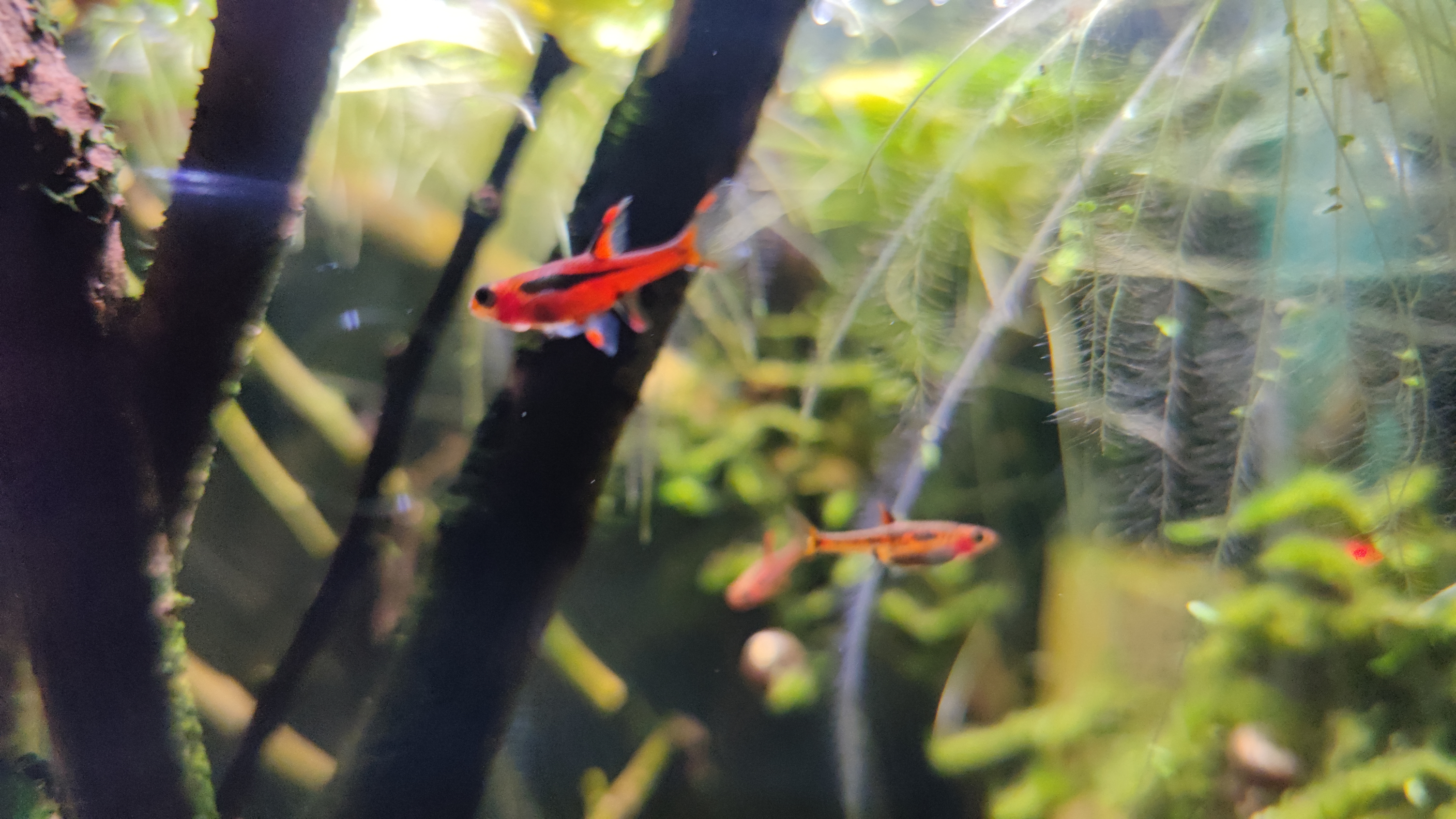 Akwarium jest w zasadzie bezobsługowe. Glony i sinice się w nim nie pojawiają, poza glonami obrastającymi drewno, ale one są cały czas w stałej ilości i tylko dodają naturalności. Ryby karmię dwa razy dziennie. Jeden posiłek to zawsze nicienie bananowe (razborki je uwielbiają), drugi to pokarmy pyłowe (Hikari First Bites, Tropical Pro Defence Micro) i drobno pokruszone pokarmy ogólne (Tropical Soft Line, Hikari Micro Pellets i inne podobne). No i to w zasadzie wszystko na temat tego zbiornika. :) Efekt możecie zobaczyć na fotkach poniżej.