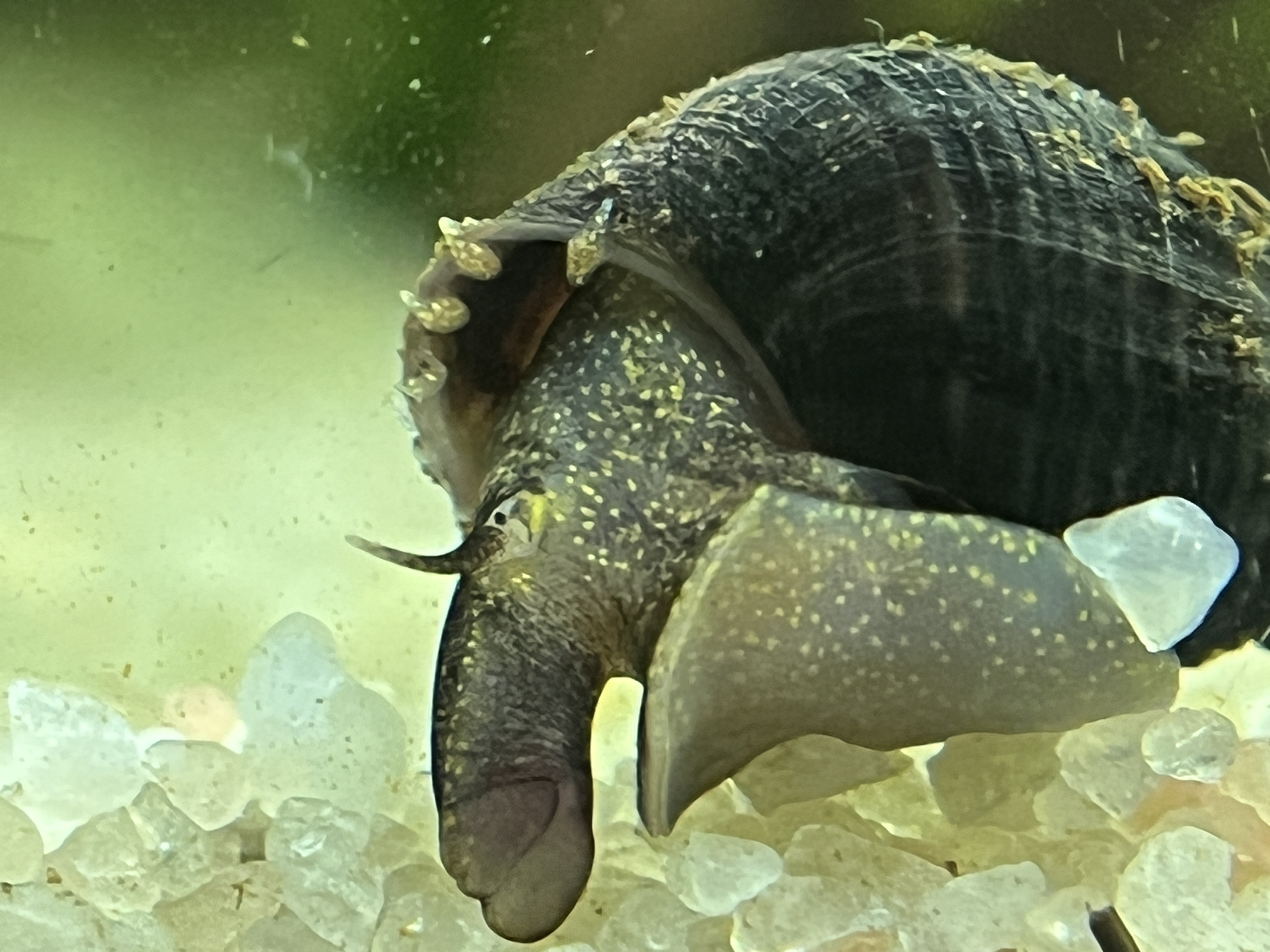 Dziś po wsypaniu karmy dla ślimaków okazało się, że mam pasażera na gapę M. Maculata. Nie jest to ten sam, o którym wspominałam. Ten jest mniejszy, czarny jak węgiel, i ukrywa się w piachu (w innym akwarium). Tak mi się zdawało przed urlopem, że jakiś mini ślimak wystaje z piachu, ale uznałam go za paproch. Wyraźnie podrósł. A oto on: