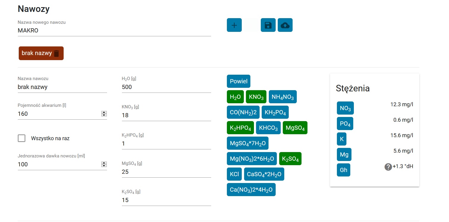 Kalkulator z http://palabras.pl/#/kalkulator należy uzupełnić pod to co wyjdzie z testów – jeśli z testów wyjdzie że np. NO3 jest na poziomie 30 ppm to należy pominąć nawożenie tą solą. Litraż akwarium – to wartość netto – np. akwarium 200l brutto będzie miało realnie 160 netto. Do policzenia wartości netto akwarium można użyć tego kalkulatora: https://az-led.pl/kalkulator-zbiornik/?cookie=yes