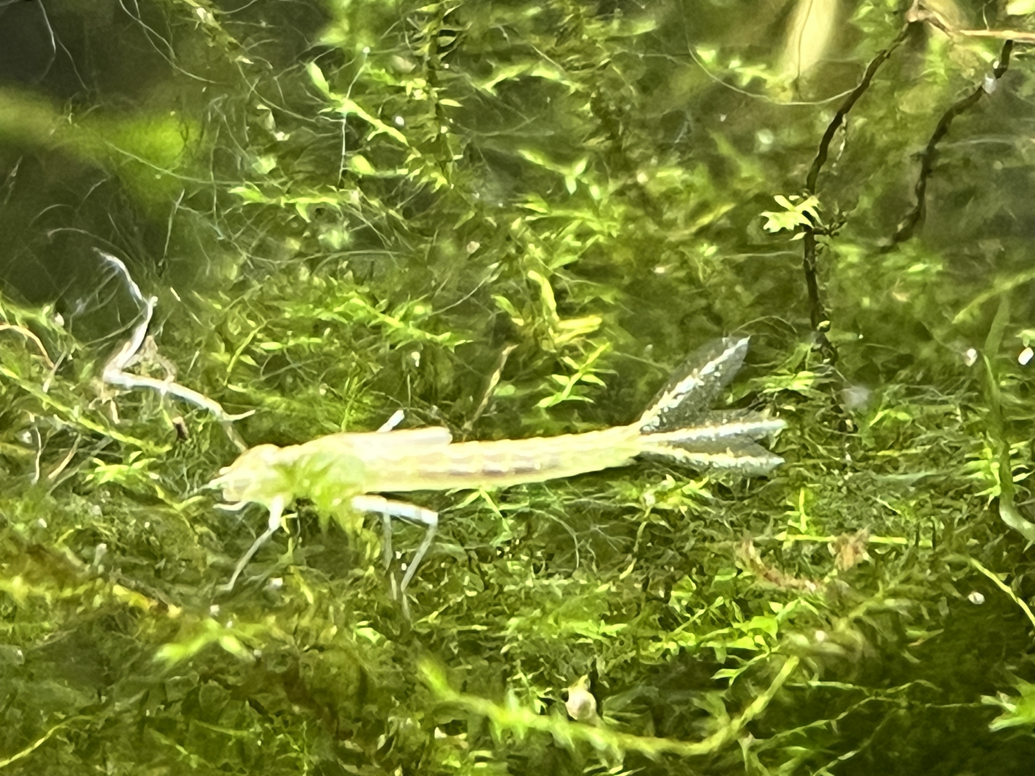 Już zidentyfikowany jako larwa ważki. Po przyjrzeniu się na filmach, które zrobiłam, widzę że jest większego rozmiaru niż krewetka.