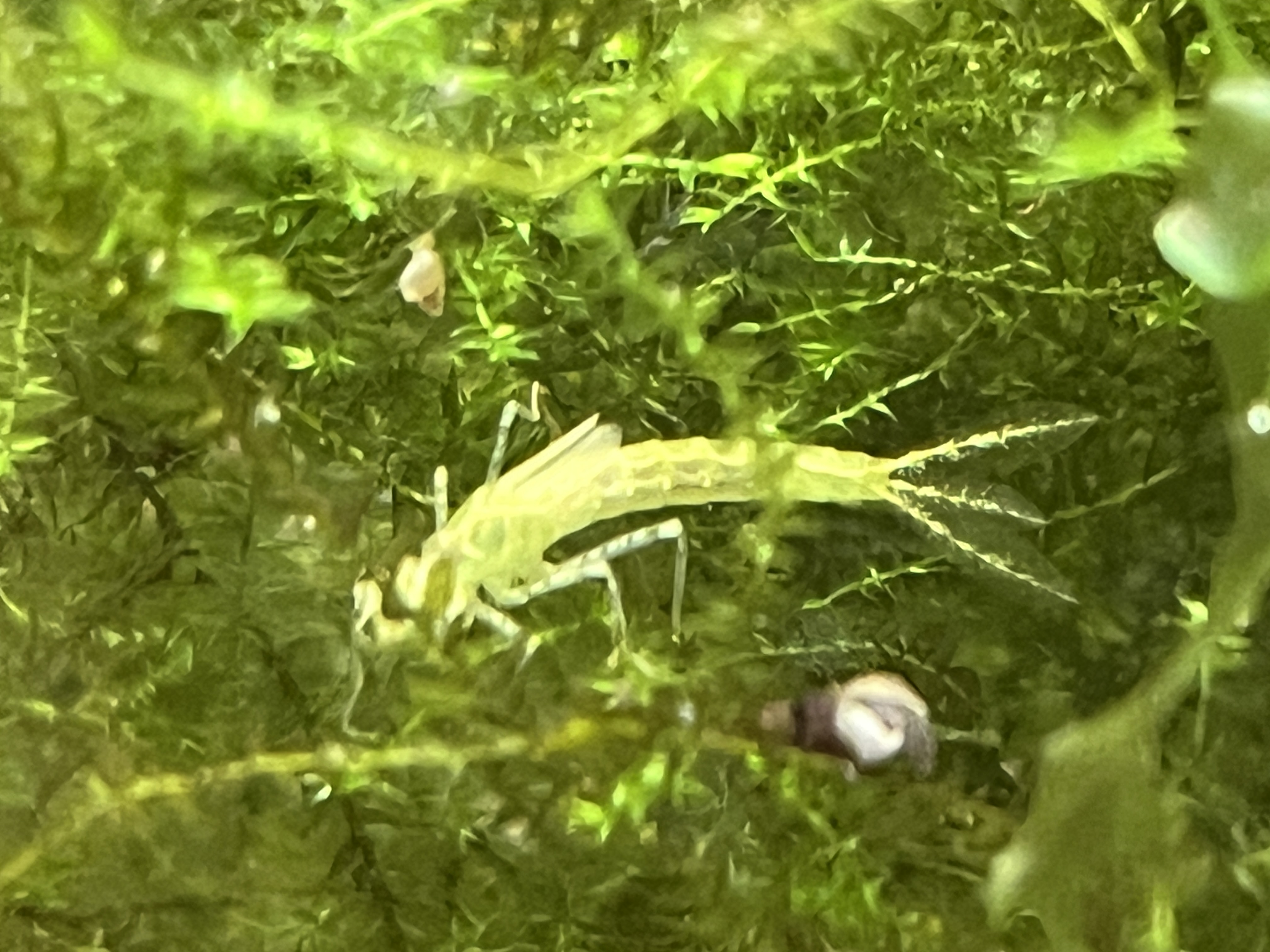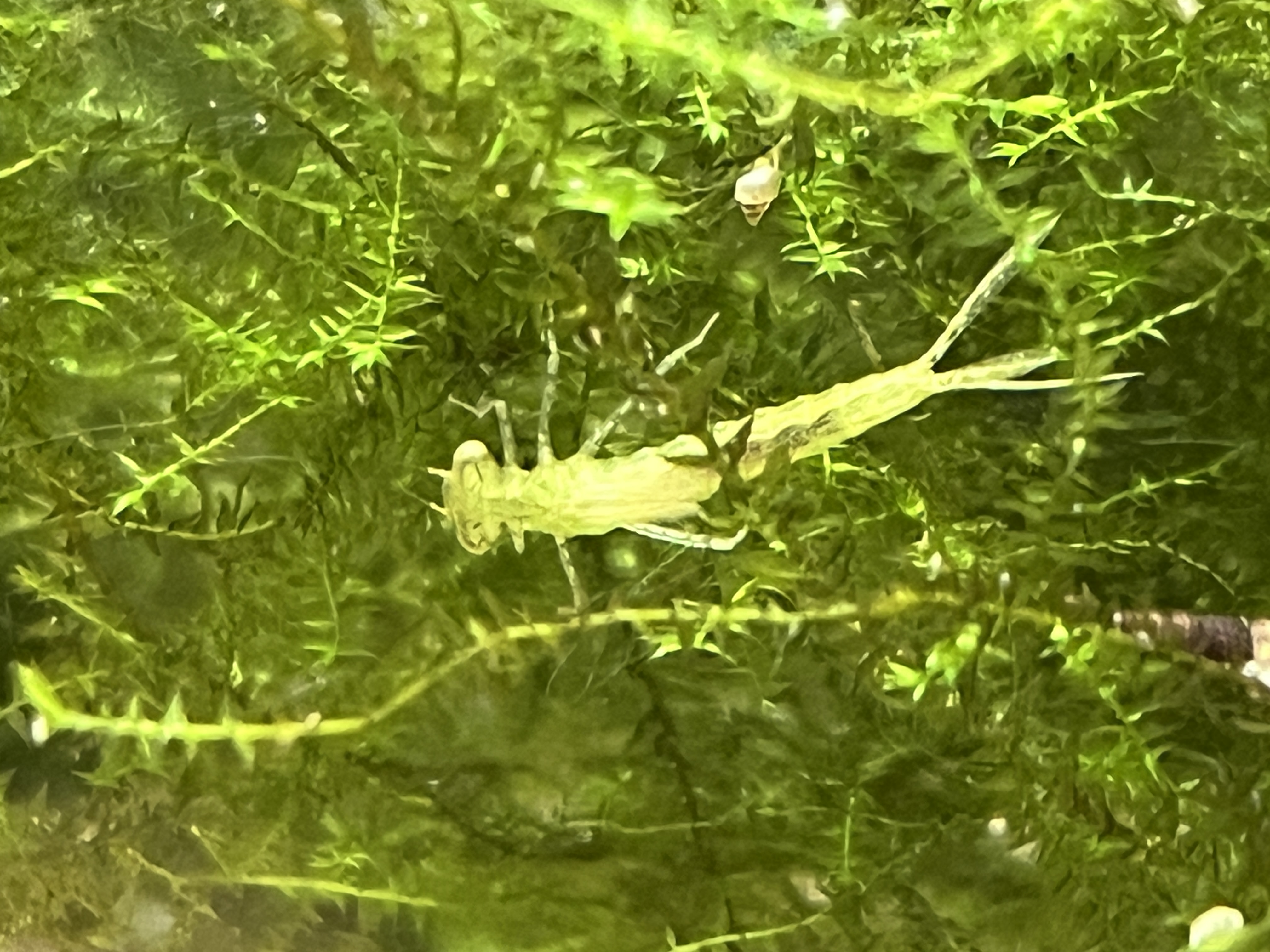 Czy ktoś może wie co to jest. Wielkości dorosłej krewetki neocaridina, więc spore, tylko chudsze. Najpierw myślałam, że to może krewetka po nieudanej wylince, ale nie. Malutkie skrzydełka. Nogi jak u pasikonika. Owadzia głowa, szeroka jak u modliszki. Czy to mogło wykluć się ze szklarki? Karmiłam jeszcze blackworms i doniczkowcem.
