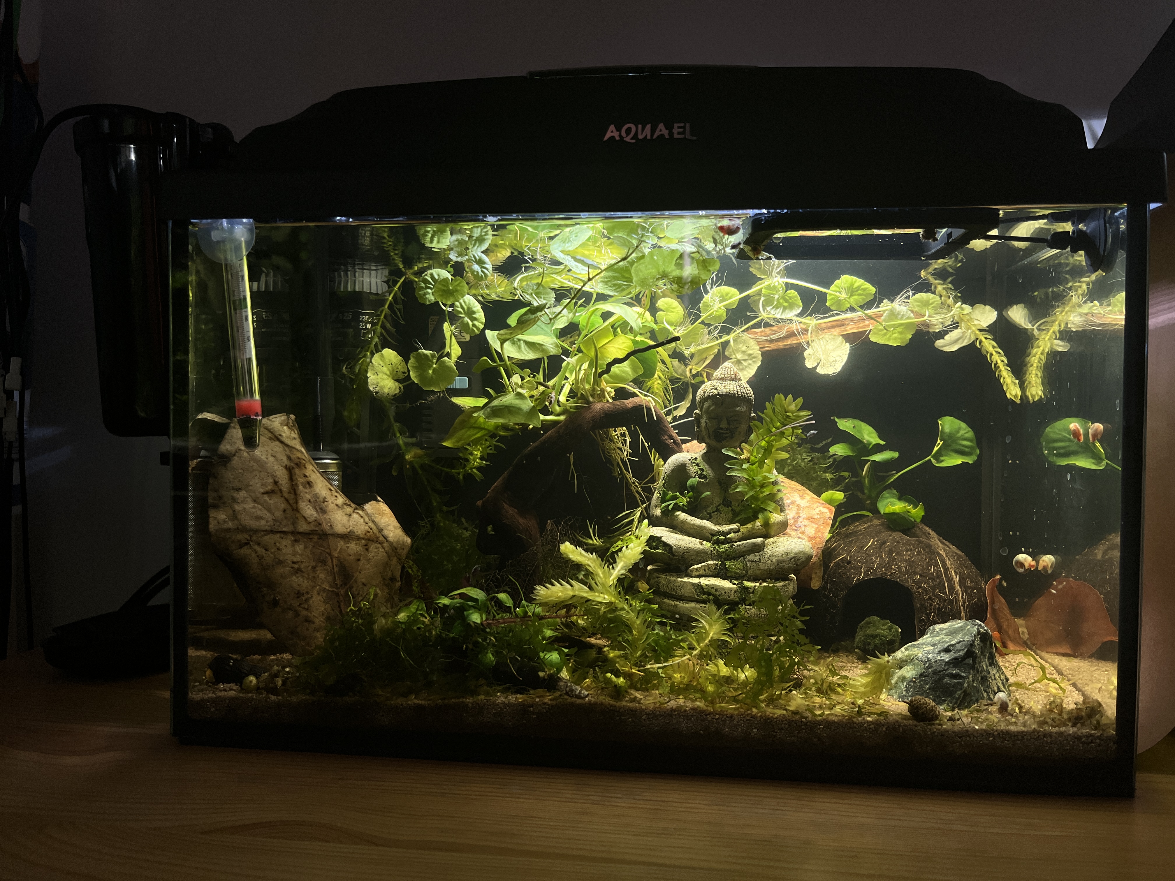 Akwarium wygląda lepiej niż na zdjęciu, jakoś zdjęcia akwariów wychodzą mi słabo (nie wiem dlaczego, bo Wam wychodzą piękne). Sztuczna ozdoba - zwykle nie lubię, ale nie mogłam się powstrzymać. Ogromnie mi się spodobał. Budda jest firmy happet z przeznaczeniem do akwariów. Dodam, że akwarium bardzosię podoba rybce, a to w sumie najważniejsze ;)