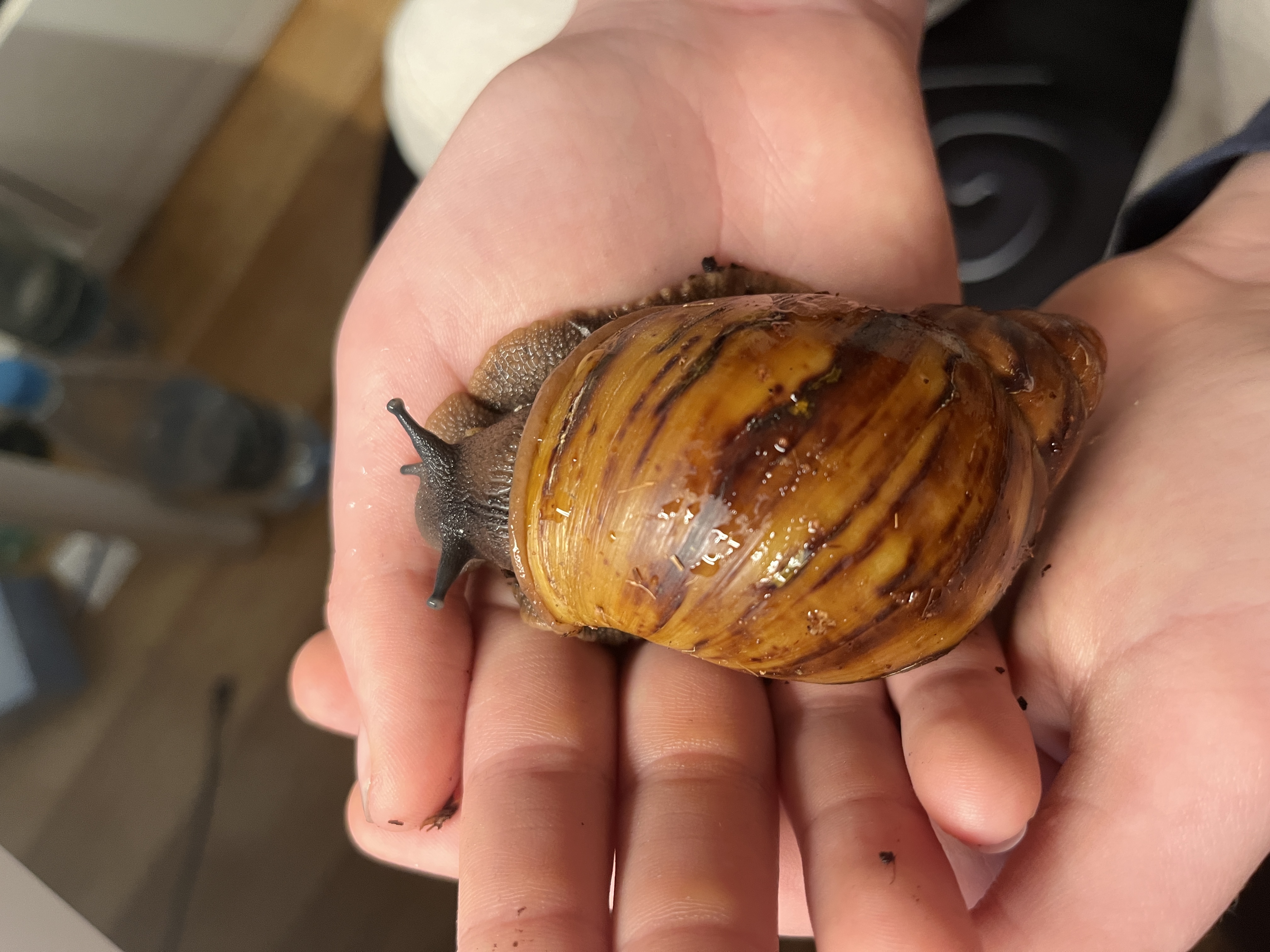 Nowy kolega dla Lissachatina Fulica. Jeszcze trochę wystraszony i szybko chowa się w muszelkę. Oba mają pół roku. Fulica zachwycona. Już drugi dzień śpi mu na głowie