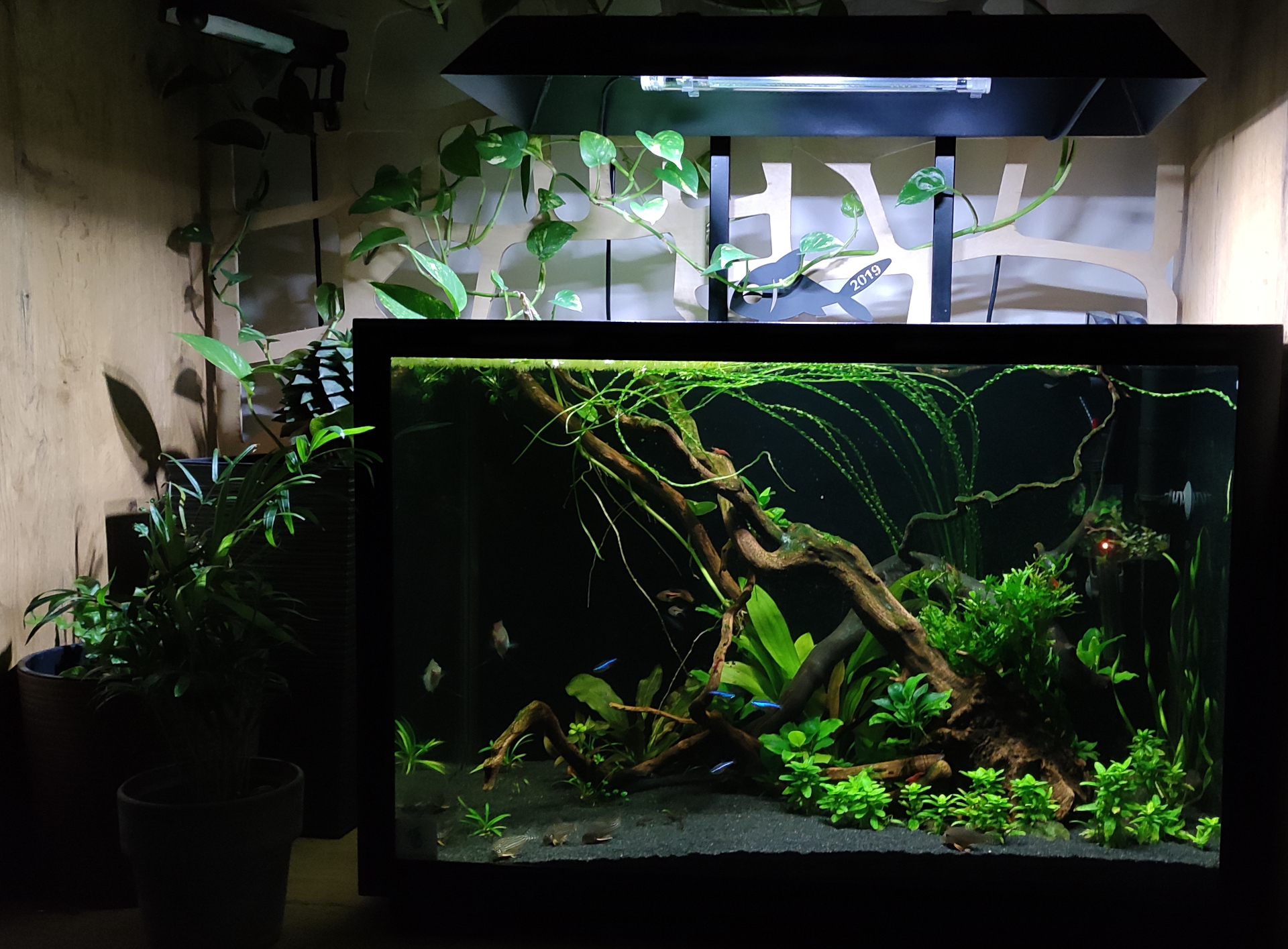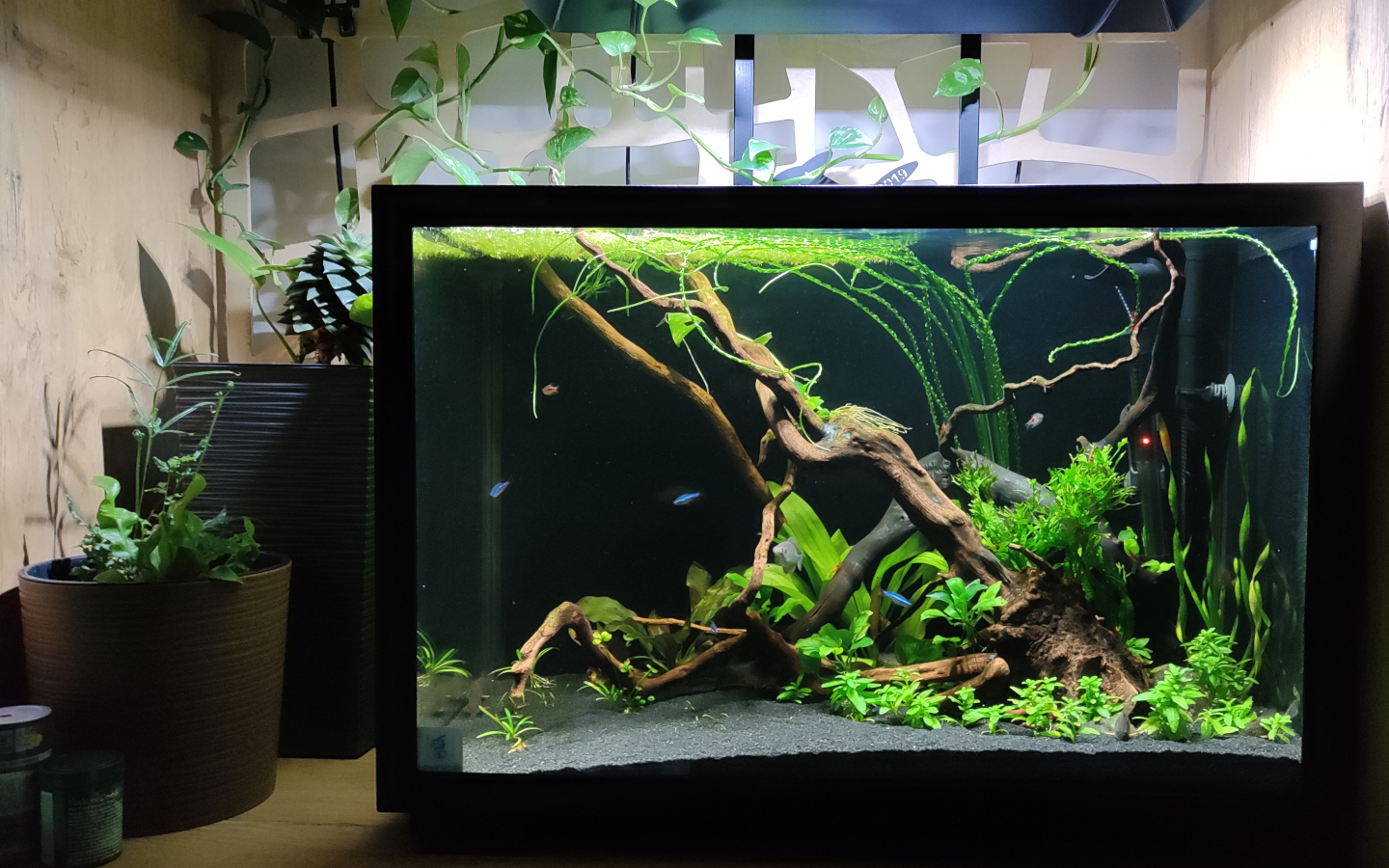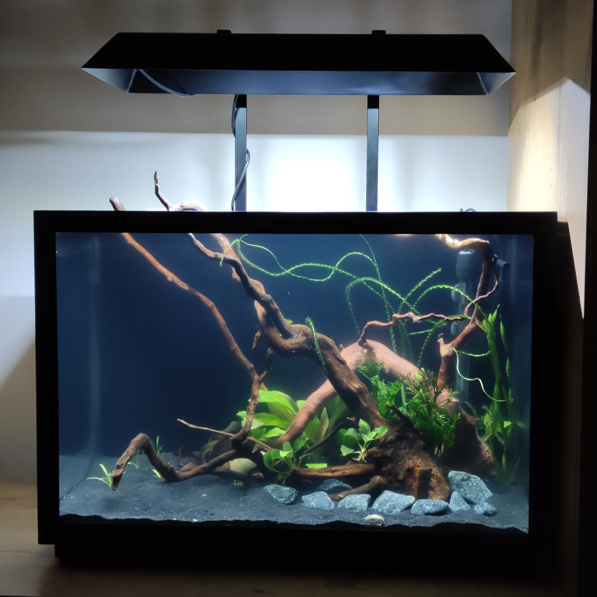 Akwarium wystartowało 11.11.2020. Początkowo sporo negatywnych opinii zebrały te kamyki otaczające podstawę korzeni, które znalazły się tam celem stabilizacji i ograniczenia w rozgrzebywaniu podłoża przez kiryski. Red moory tradycyjnie oblazły śluzem, trochę pierwotniaków, ale to sobie przeszło. W międzyczasie uzupełniłem otoczenie akwarium montując taki ażurek i doniczki z badylkami.