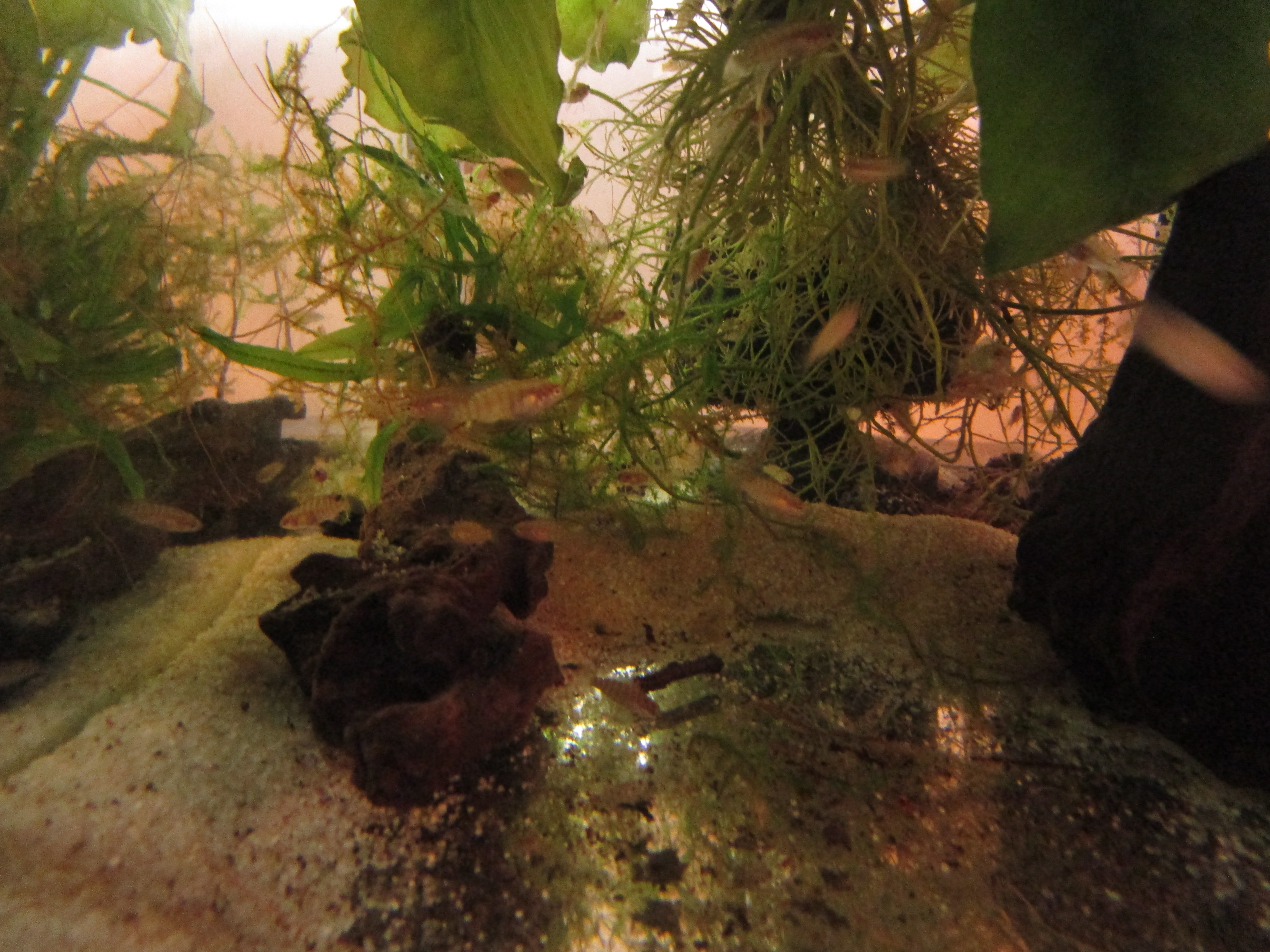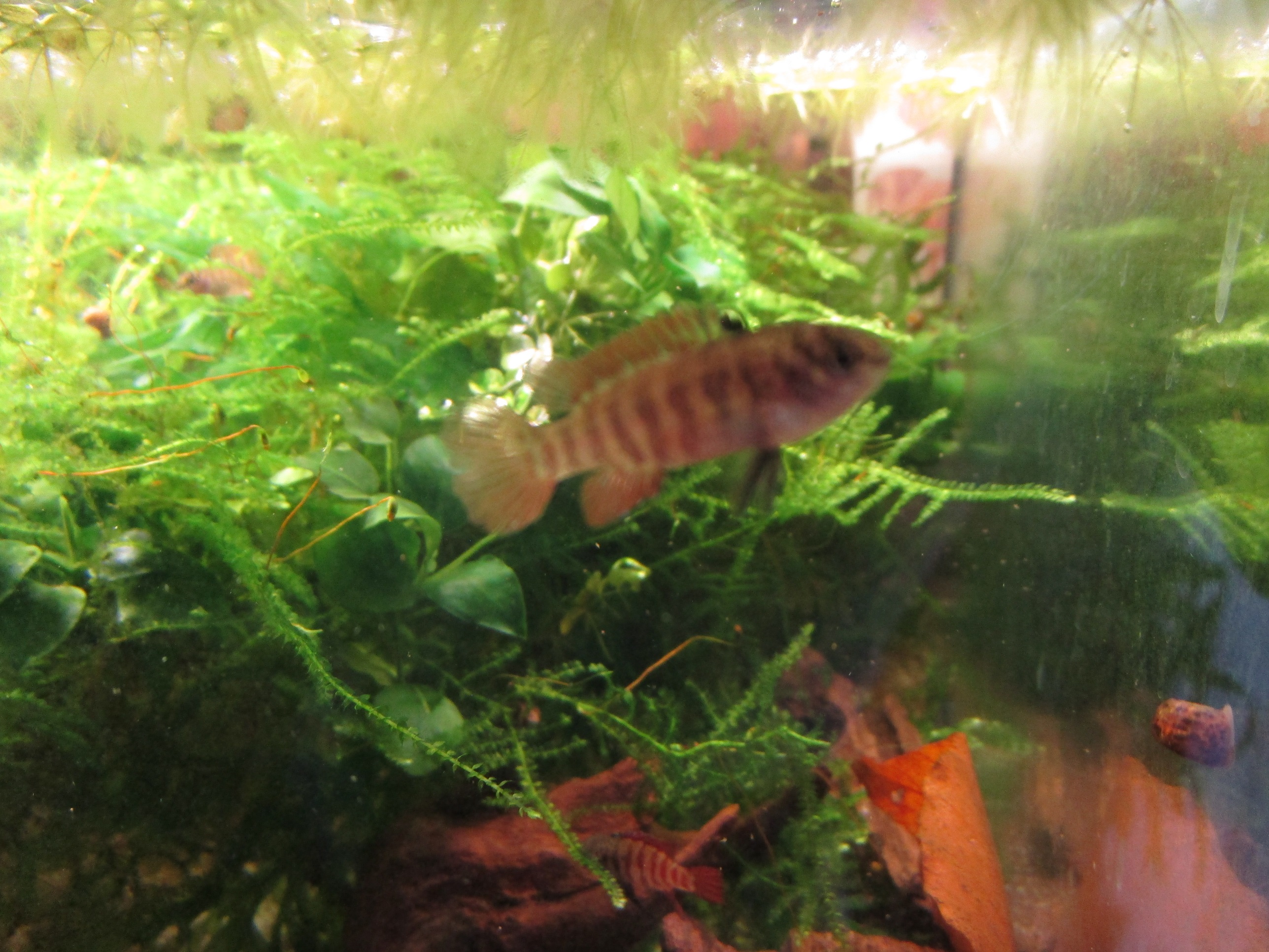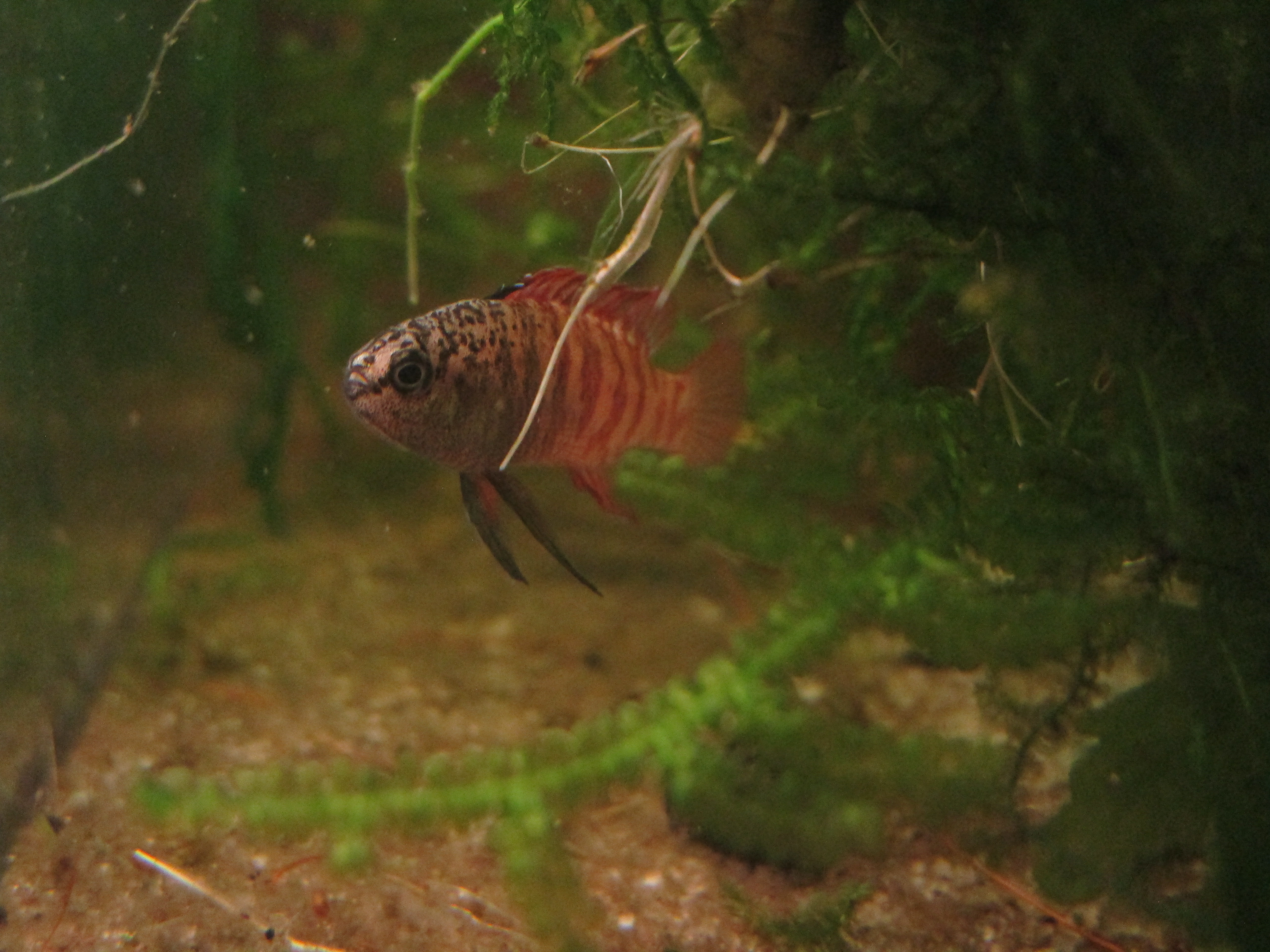 Poniżej zdominowany samiec, ale samica, którą miałem w izolatce, wyglądała identycznie (miała pasy, czarną plamkę u nasady płetwy grzbietowej, czerwonawe płetwy nieparzyste, ciemne płetwy brzuszne - zwątpiłem już, że to samica, ale nią na 100% była, gdyż po dodaniu samca zniosła ikrę). Czasem, gdy ryby są w dobrej formie i ustawią się pod światło, można dostrzec ikrę w brzuchu.