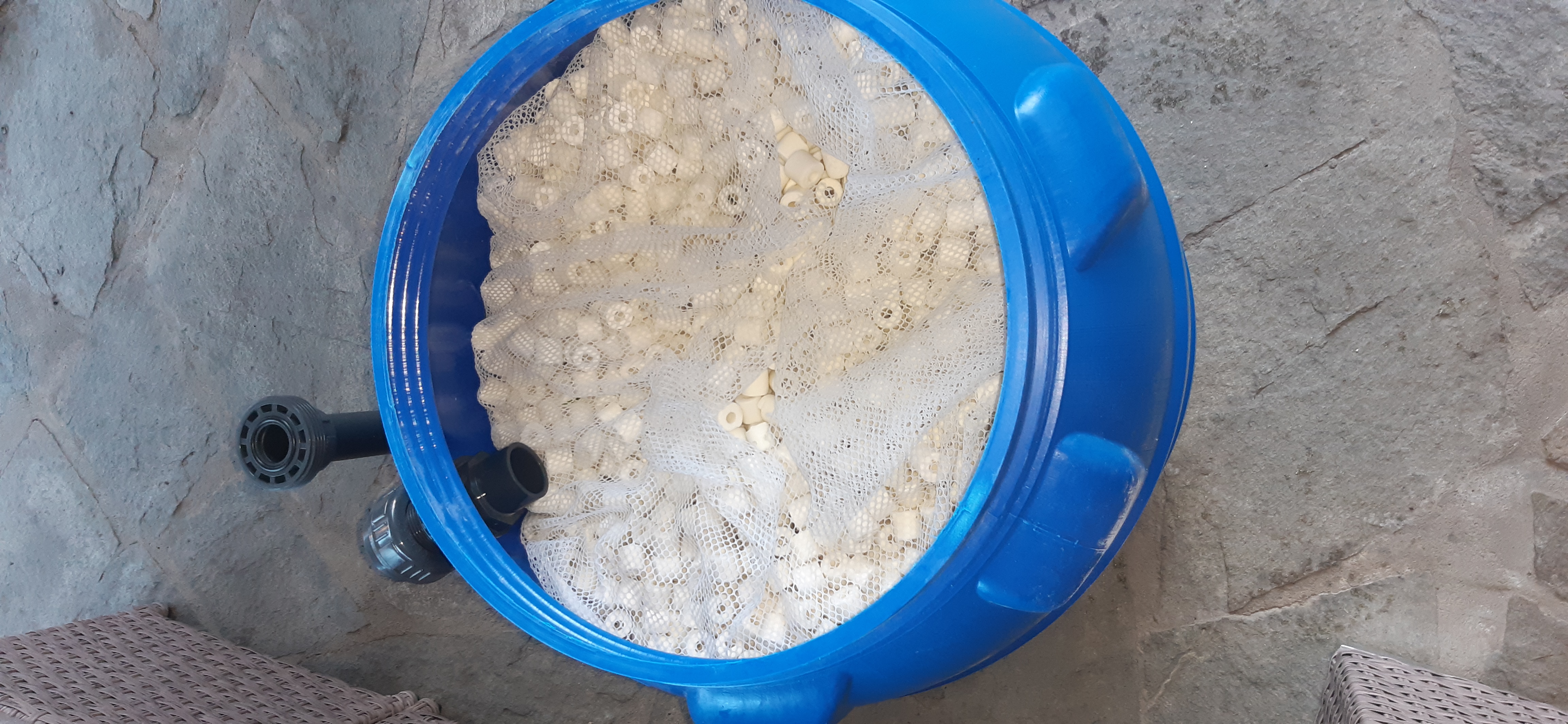 Dodatkowa zaleta beczki... jak woda nie sięga komina może filtr chodzić, albo przez deszczownicę (rośliny zraszam akurat), albo w obiegu ze spustem dolnym. Wtedy nie chlapie po szybach.