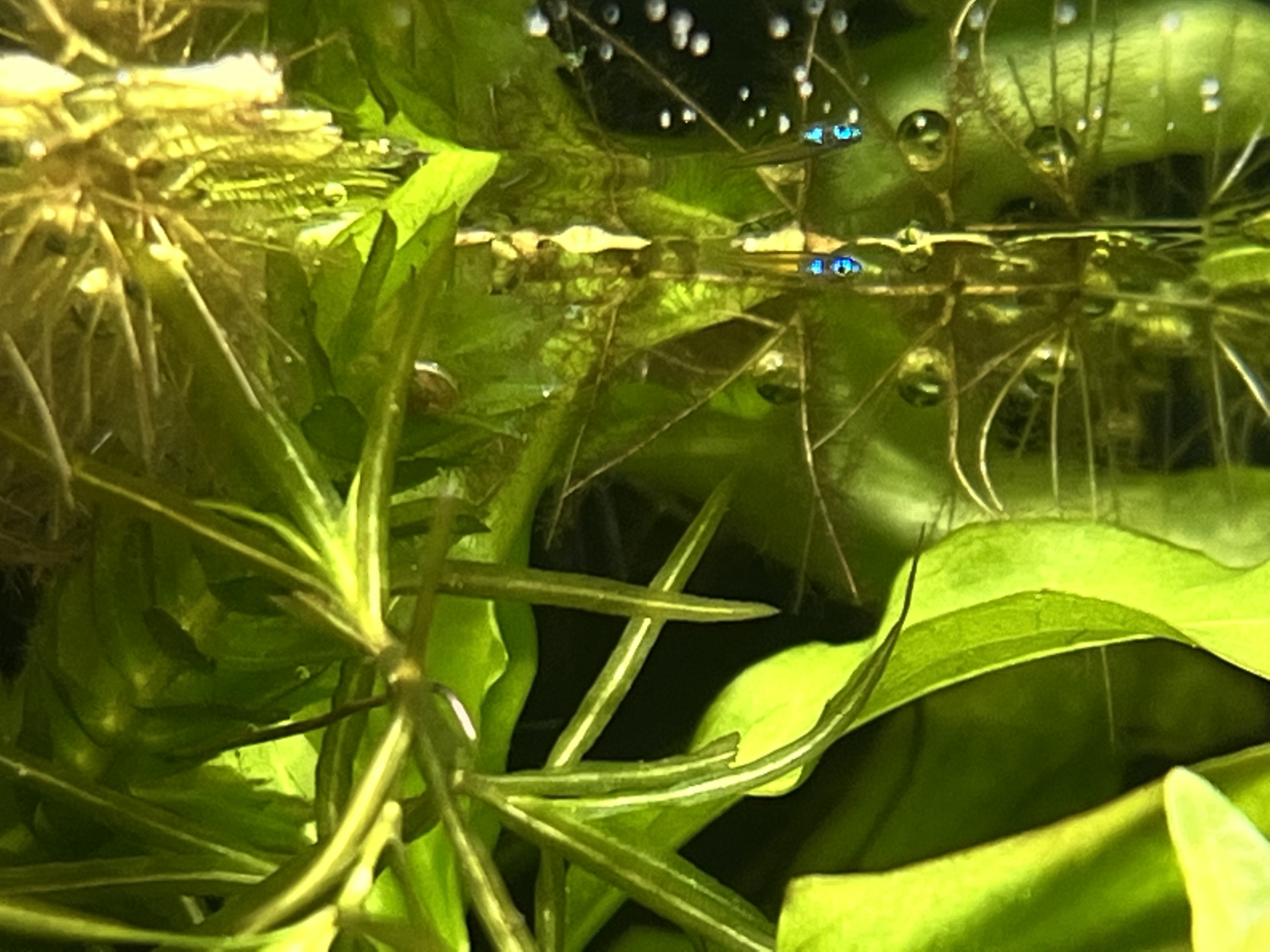 świeci jak niebieska latarnia morska. Poniżej zdjęcia. Na pierwszym obie rybki. Niestety niewyraźnie bo starsza rybka nabrała szybkości. Na każdym zdjęciu ma tłusty brzuch bo strzelam fotki w porze karmienia