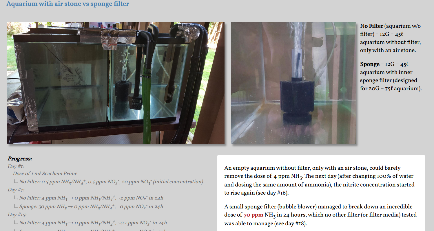 To say that there may be so-called "peaks" or mini-cycles in the aquarium, during which there is a local, short-term or sudden increase in the concentration of ammoniacal nitrogen, which can lead to the germination and subsequent proliferation of algae, are (given the enormous nitrification capacity of the empty aquarium) most likely nonsense. It can be assumed that even some reasonably large increase in ammonia concentration (e.g. dead fish decaying somewhere unnoticed) may not pose any problem for an already established colony of nitrifying bacteria, especially considering that even in an empty aquarium (with a filter without filter media) it can arise a large enough colony of nitrifying bacteria to break down an incredible 30 ppm of NH3/NH4+ in 24 hours. So why should an aquarist have an oversized filter when an empty aquarium (without filter media, substrate, plants, and other potential areas for bacteria) can host such a "huge" amount of nitrifying bacteria that there is a reserve for at least 30 ppm of NH3/NH4+? Or does anyone find such a reserve inadequate? Alternatively, a 275 mℓ of Seachem Matrix media (or the same amount of ordinary pumice) provides a nitrification capacity for no more than 30 ppm NH3/NH4+. An empty aquarium represents a nitrification capacity to break down at least 30 ppm NH3/NH4+ (maybe more ... the test was terminated when this value was reached). Is there anyone who sees any difference between these 30 vs 30 ppm?