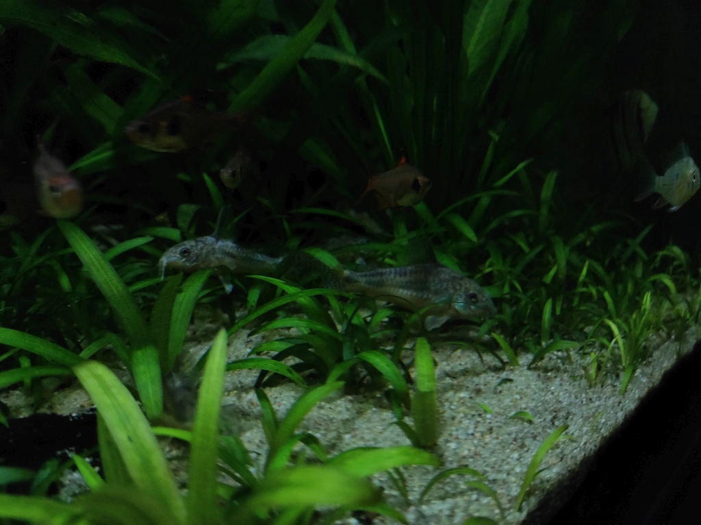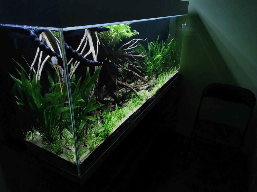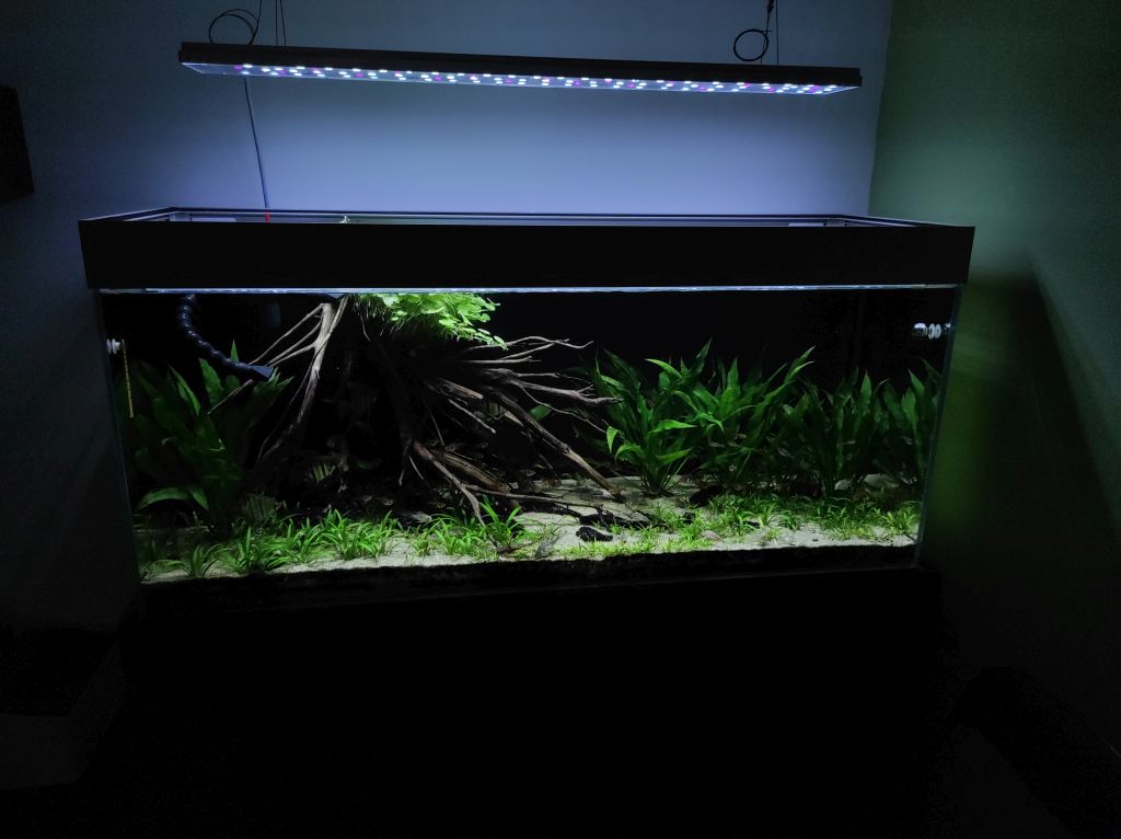 Od ostatniego czasu zaszło kilka zmian. Wyleciało sporo drewna na rzecz roślin. Po dwumiesięcznej stagnacji "zielsko" wreszcie zaczęło rosnąć i konieczne było "odchudzenie" aranżu. Widać jak Sagittaria subulata i Echinodorus tenellus uwalnia bąble co w mojej ocenie przy tej wysokości lampy i akwarium nastraja optymistycznie. Zmieniłem także pompę na Jebao MDP 10000 - ustawiona na 70% mocy. Jednak dodatkowe kilka [W] mocy robi lepszą robotę i przy opcji dwóch wylotów widać, że jest zdecydowanie lepsza cyrkulacja niż przy poprzednim modelu.