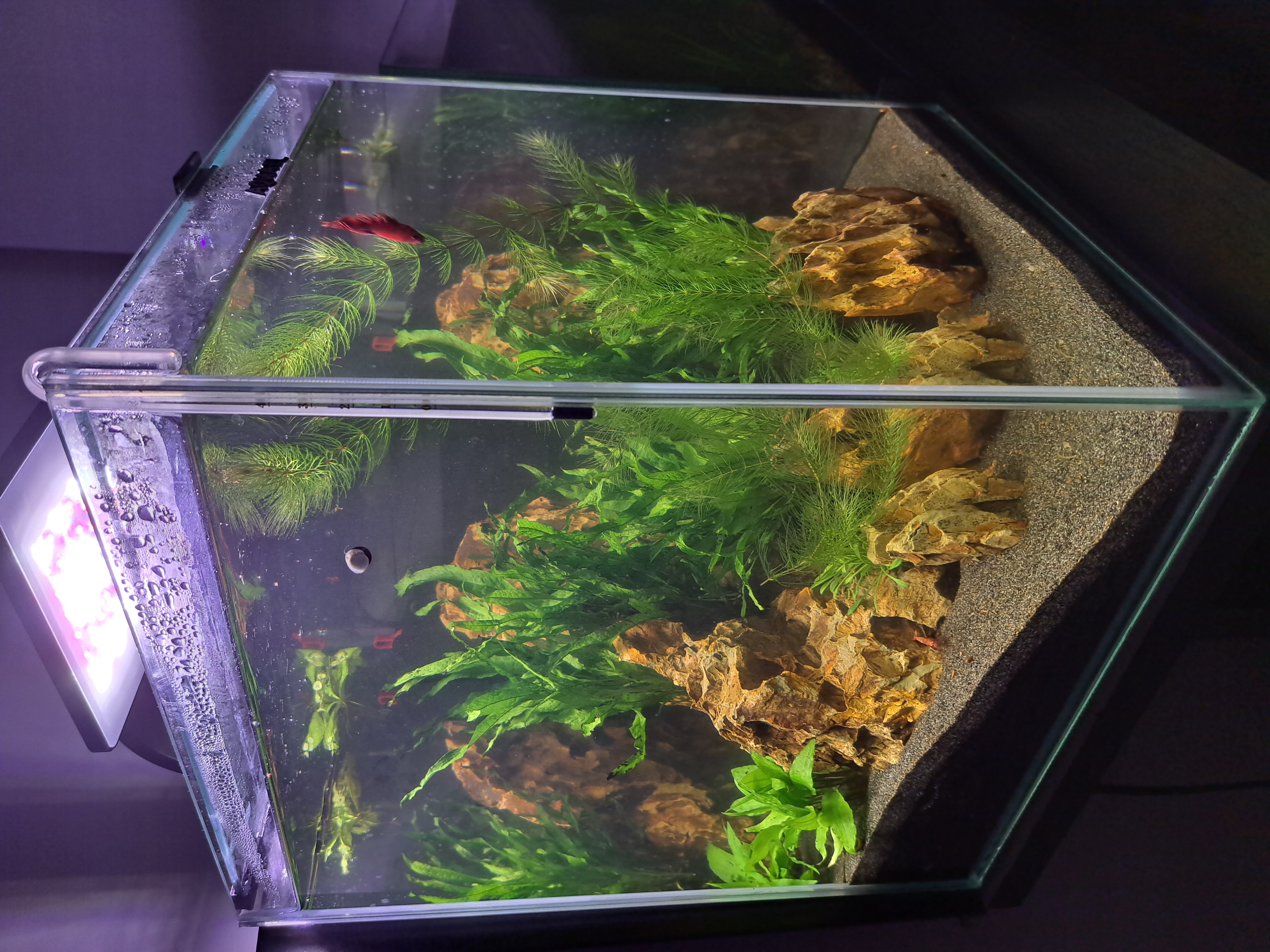 Przedstawiam Wam małe akwarium, w którym schronienie znalazł Bojownik, krewetka Amano i kilka ślimaków.