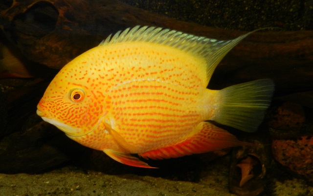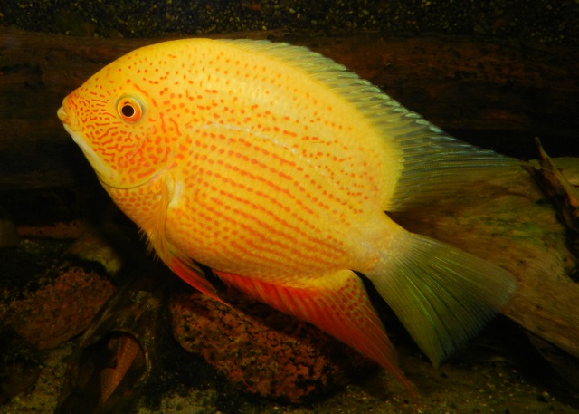 Pielęgnica sewerum - duża ryba dorastająca do 25 cm wielkości, raczej dla posiadaczy większych akwariów 150 i więcej cm długości. Dość łagodna, nadająca się do akwarium towarzyskiego, nawet ze znacznie mniejszymi od niej rybami. Warto wspomnieć, że sewerum jest pielęgnicą roślinożerną, amatorzy akwariów roślinnych raczej powinni unikać tego gatunku - wszelka zielenina zostanie potraktowana jako karma. Osobiście zawsze ten gatunek trzymałem i trzymam obecnie wyłącznie w pojedynczych parach, ale widywałem również hodowle stadne. Poniżej na zdjęciach młode osobniki odmiany "rotkeil" oraz dorosłe odmiany "yellow red spotted".