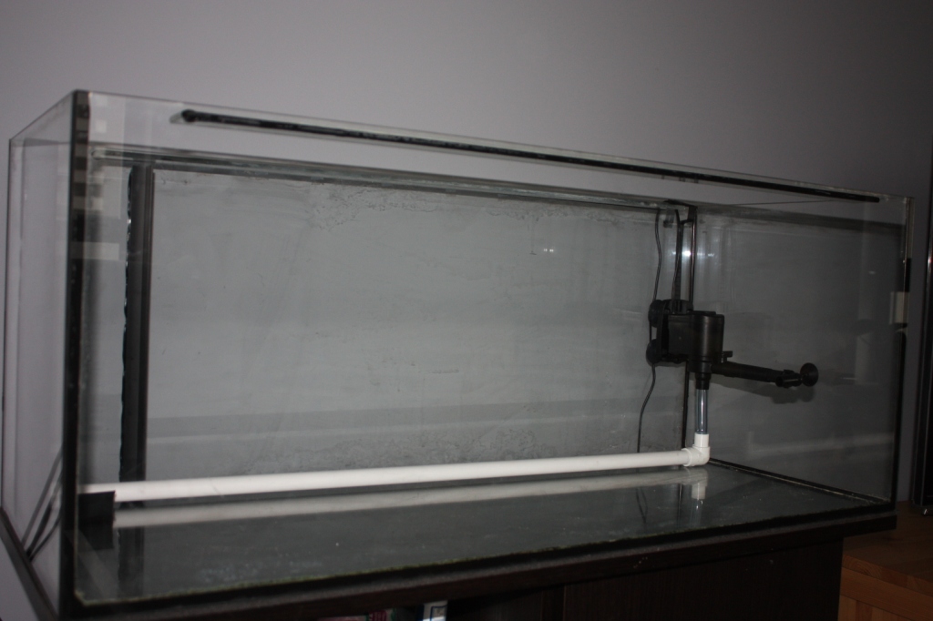 Tak się to prezentowało po przymiarkach wstępnych (wybaczcie pochlapane szyby i tylko połowę wody, fotka na szybko w trakcie pracy) - szczerze mówiąc nie prezentowało się to najlepiej, nie byłem zadowolony...: Jak widać głowice w miarę nie rzucają się w oczy, chociaż zawsze można by lepiej je ukryć Kolejny etap to będzie dodanie podłoża, wsadzenie roślin i detaling