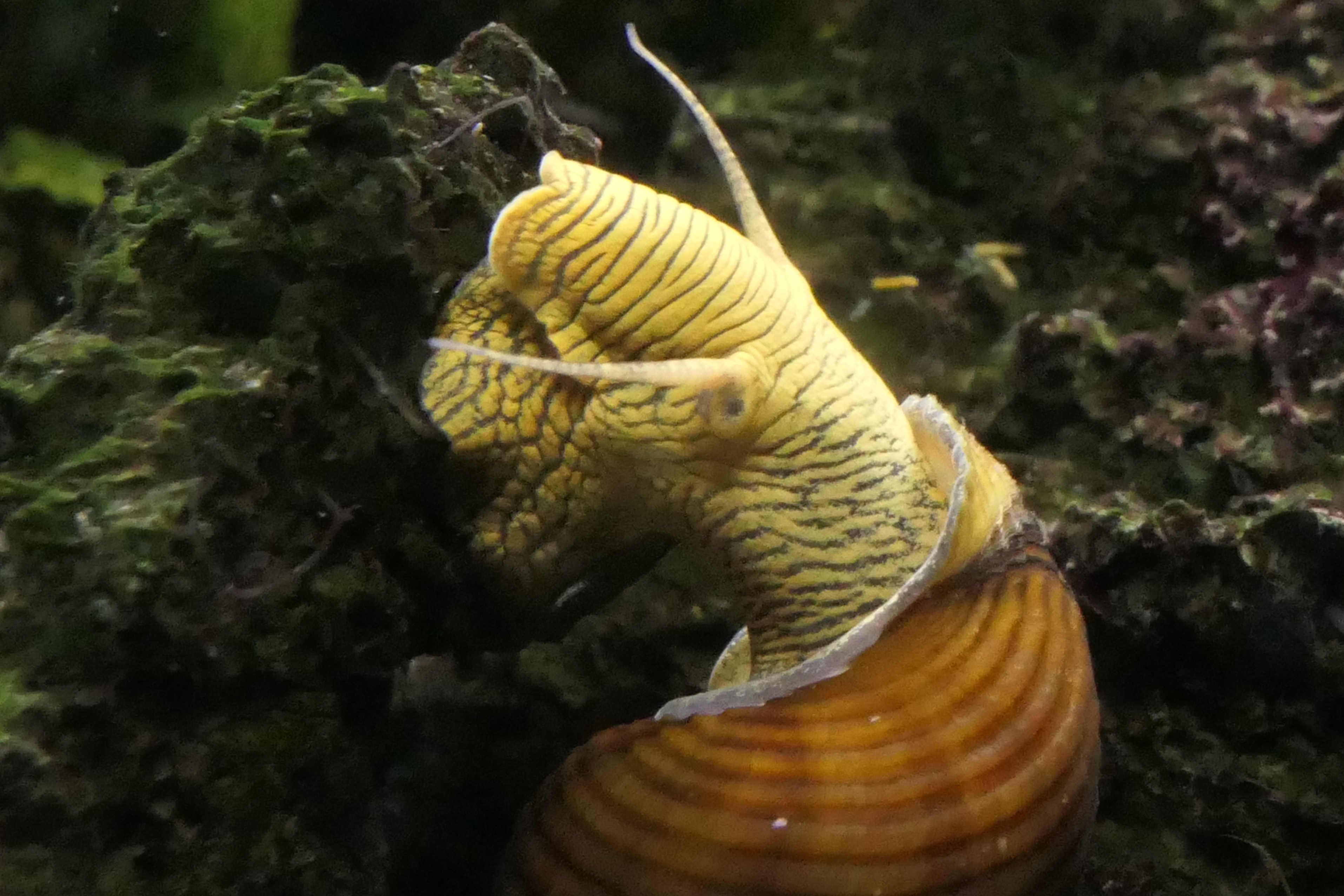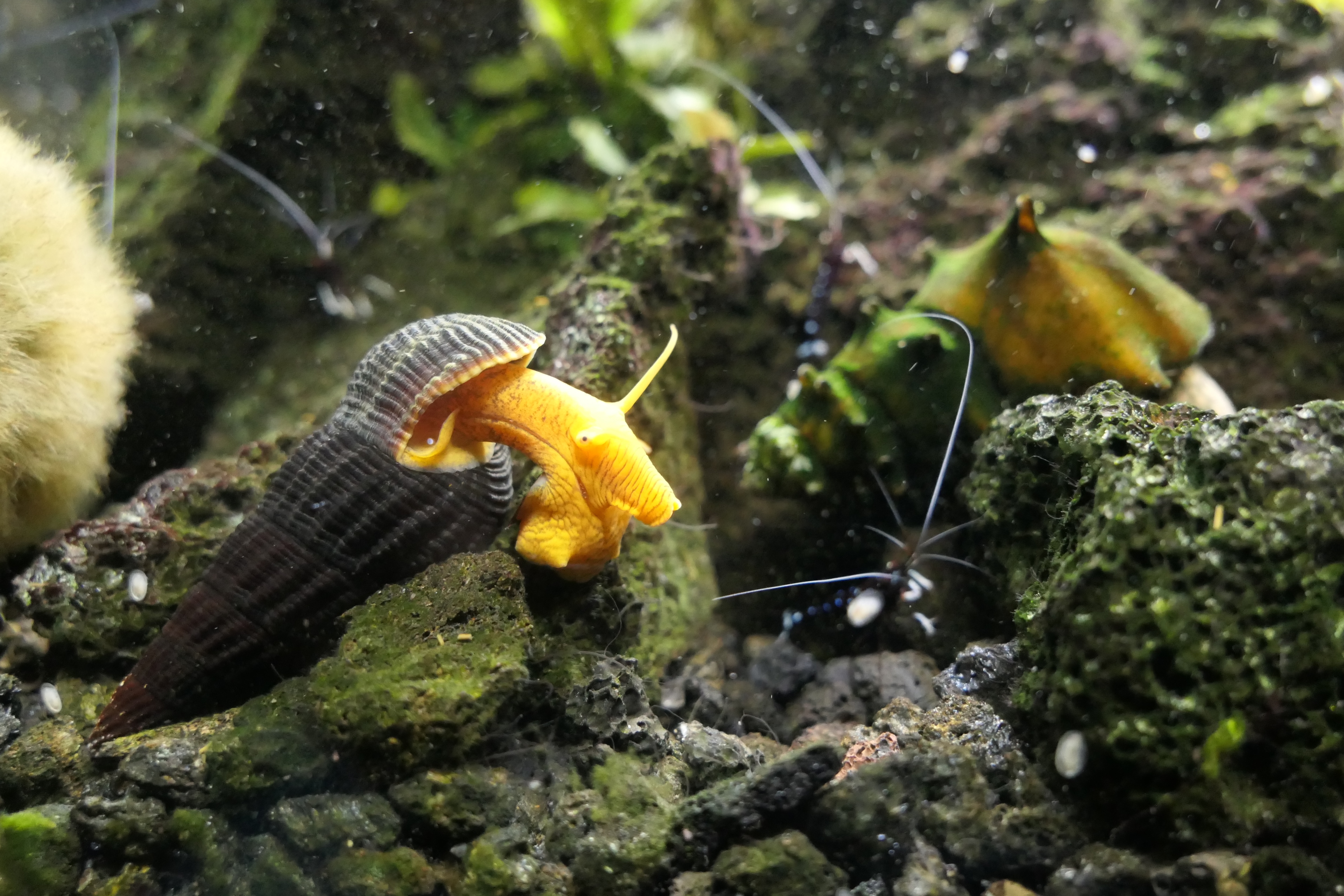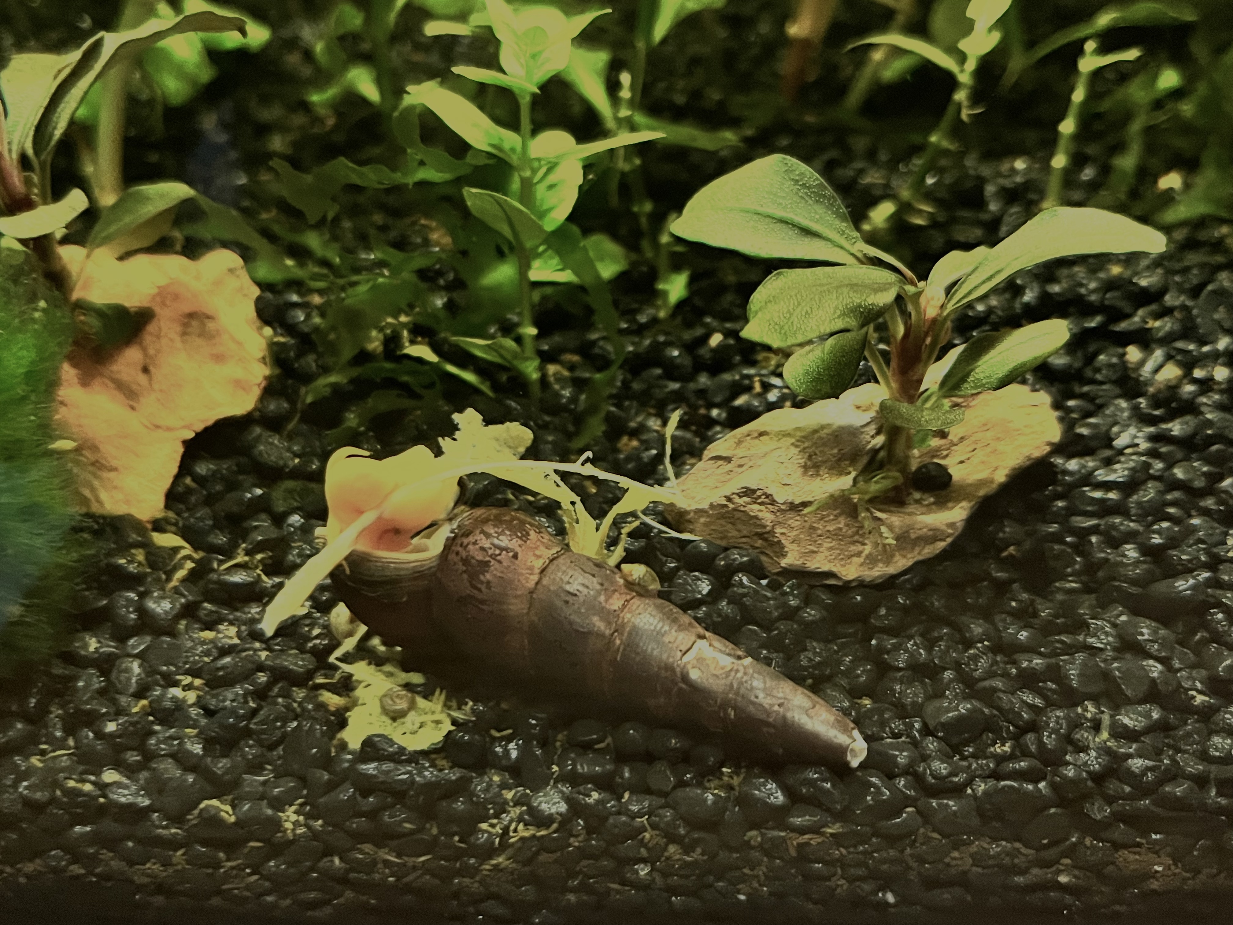 Tylomelania sp. Yellow Rabbit. Byłam w sklepie z Bojkami i złapałam sobie jedną. Fajna jest. Je ogórka i łazi po całym akwarium. Jak często dokarmiać jak akwarium młode?