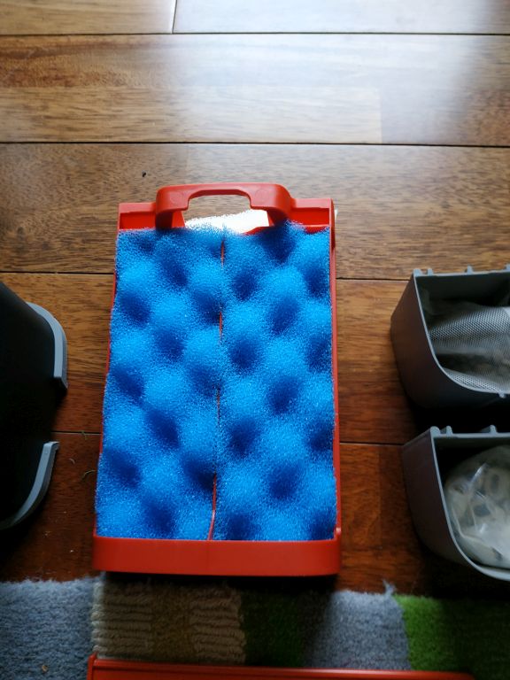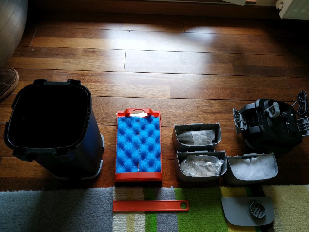 Kubełek - kawał solidnego, grubego plastiku. Jest tak skonstruowany, że wkłady można umieścić tylko i wyłącznie w jeden określony sposób. Część mechaniczna gąbki i część biologiczna musi wrócić tak jak była, nie da się tego umieścić na odwrót. Całość stoi na solidnych gumowych nogach.