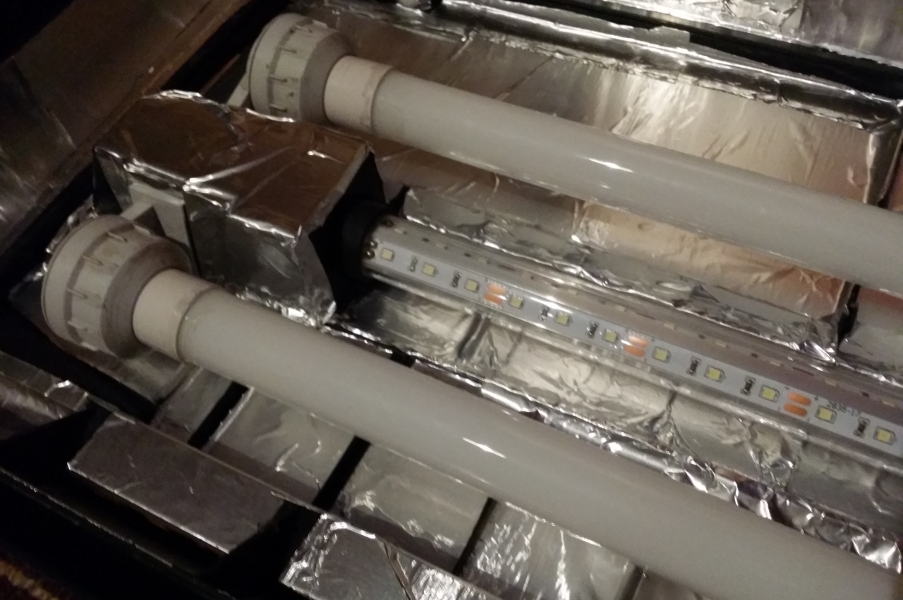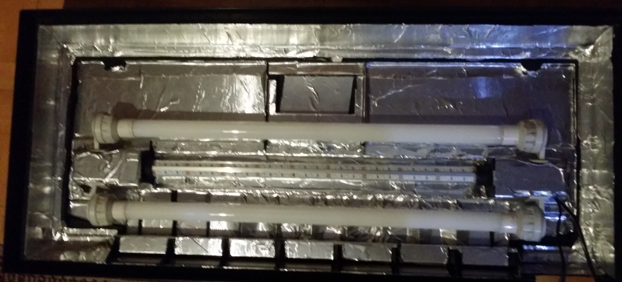 Naprawiłem zawias w pokrywie, wyciąłem koryto pod miejsce na dodatkową świetlówkę, co to kupiłem kiedyś okazyjnie, a akwarium 60 cm już nie, żeby pasowała. Te teósemki to też ledy, kilkuzłotowe "smartodopychacze z allegro", Jakby były za słabe, łatwo będzie zmienić. Może kiedyś dojdzie coś imitującego świt/zmierzch, ale tak jak w starym akwarium, z kilku słabych modułów ledowych, bo było w sam raz.