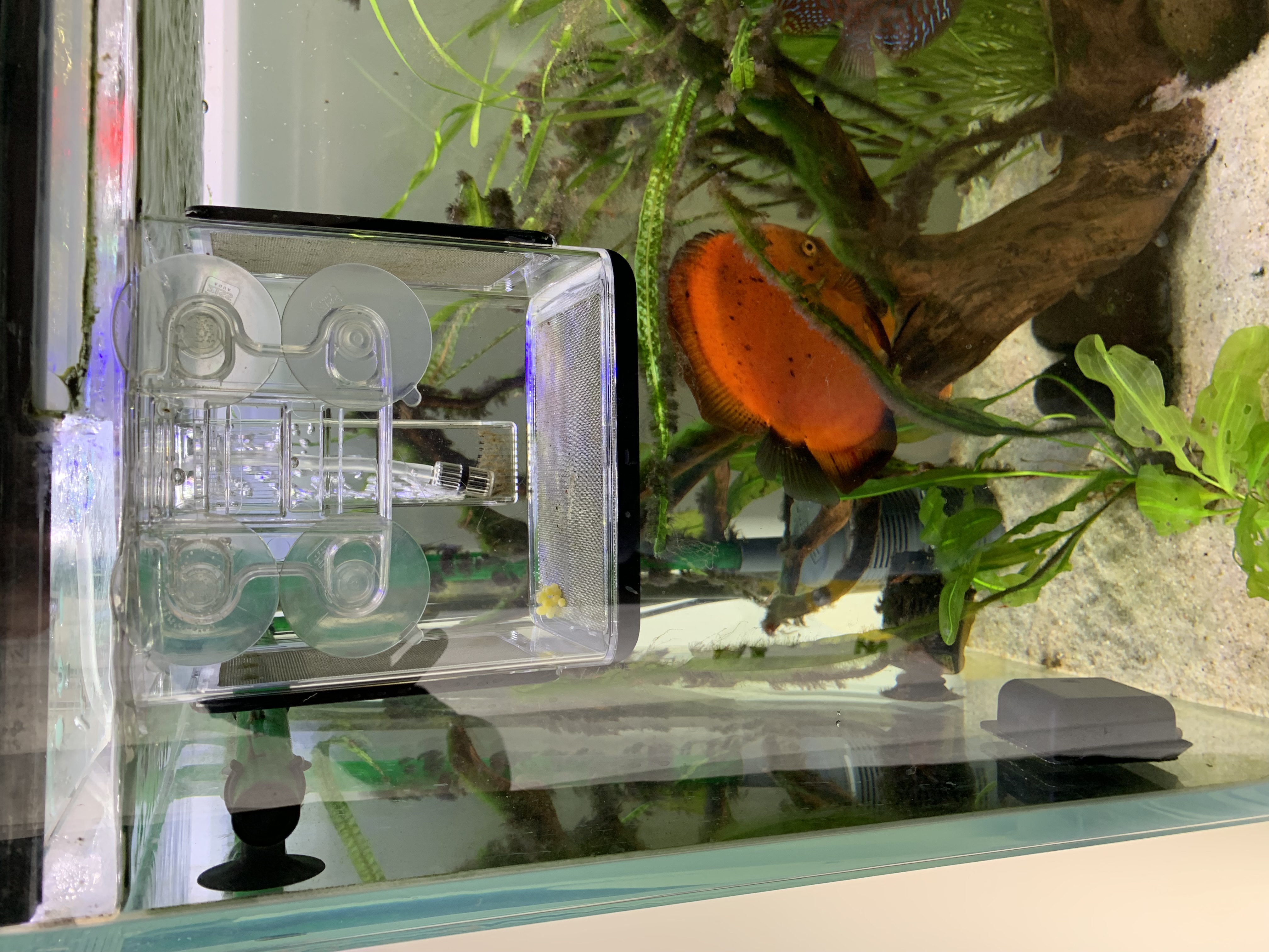 Idzie mi z ta ikra jak krew z nosa.. pierwsza przegapiłem i została zniszczona przez samice, drugą - miałem już przełowić ale zostawiłem sprawę do rana.. rano nie było już co przeławiać. Trzecia.. przeniosłem ikre do kotnika z jaskinia i samcem.. zniszczył ją po pierwszej nocy... czwarta - zniszczył poprzednia dziad to przeniosłem samą ikrę .. od początku nie podobał mi sie jej kolor i spleśniała... Kotnik - jak na zdjęciu - 15x15 cm, ustawiam go przy wylocie filtra + ma swój napęd (kostke natleniającą)