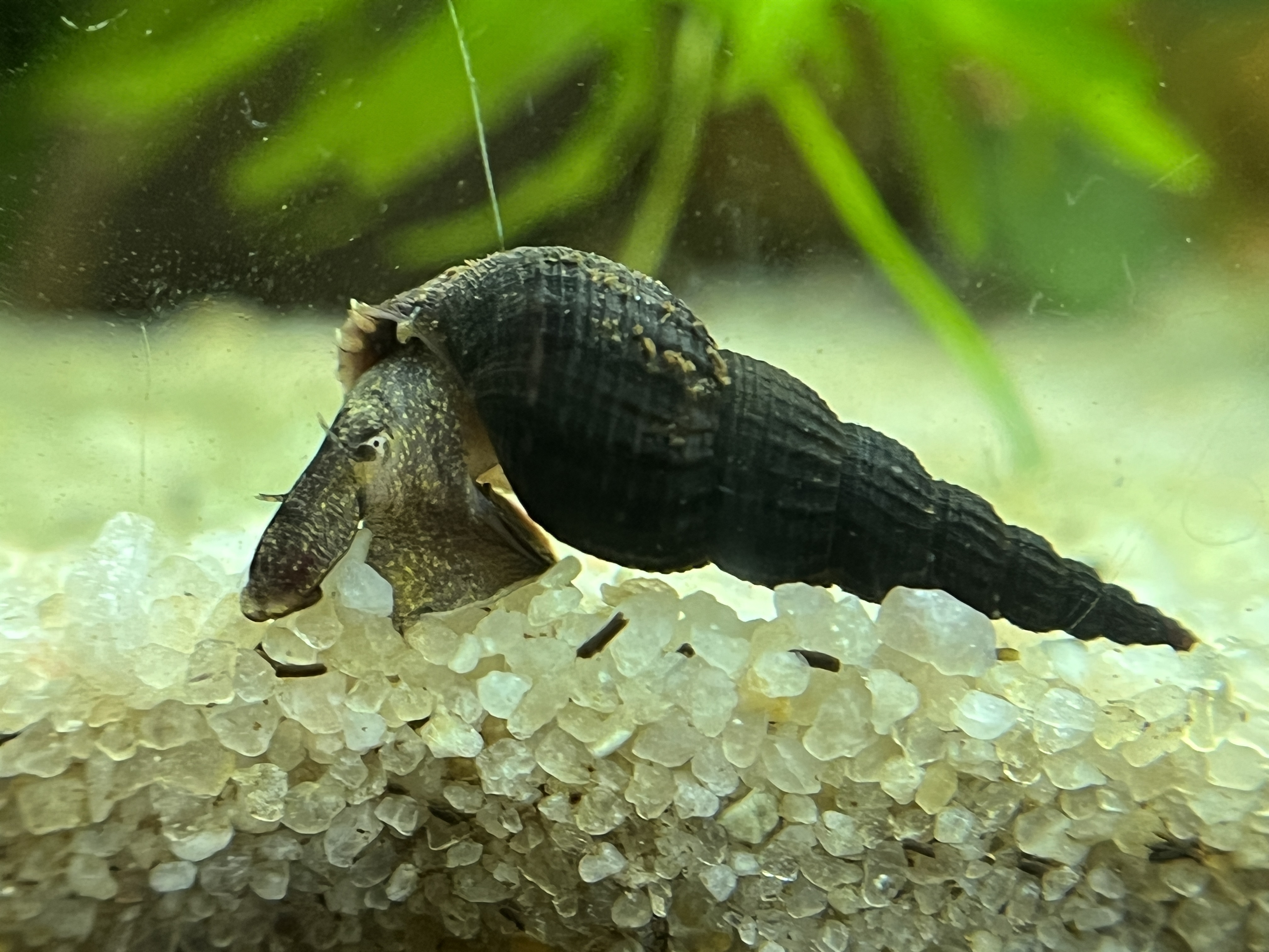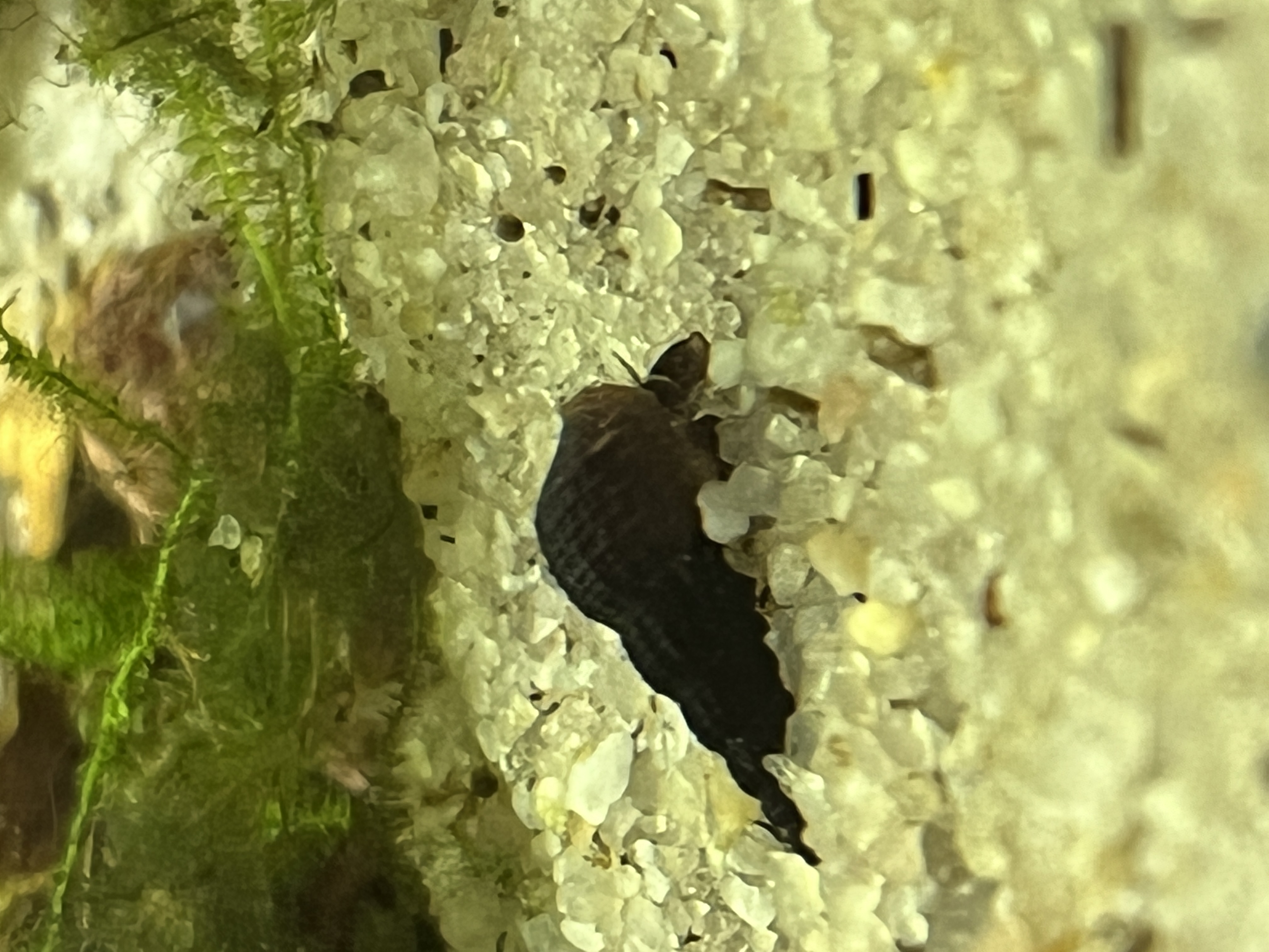 Dziś po wsypaniu karmy dla ślimaków okazało się, że mam pasażera na gapę M. Maculata. Nie jest to ten sam, o którym wspominałam. Ten jest mniejszy, czarny jak węgiel, i ukrywa się w piachu (w innym akwarium). Tak mi się zdawało przed urlopem, że jakiś mini ślimak wystaje z piachu, ale uznałam go za paproch. Wyraźnie podrósł. A oto on: