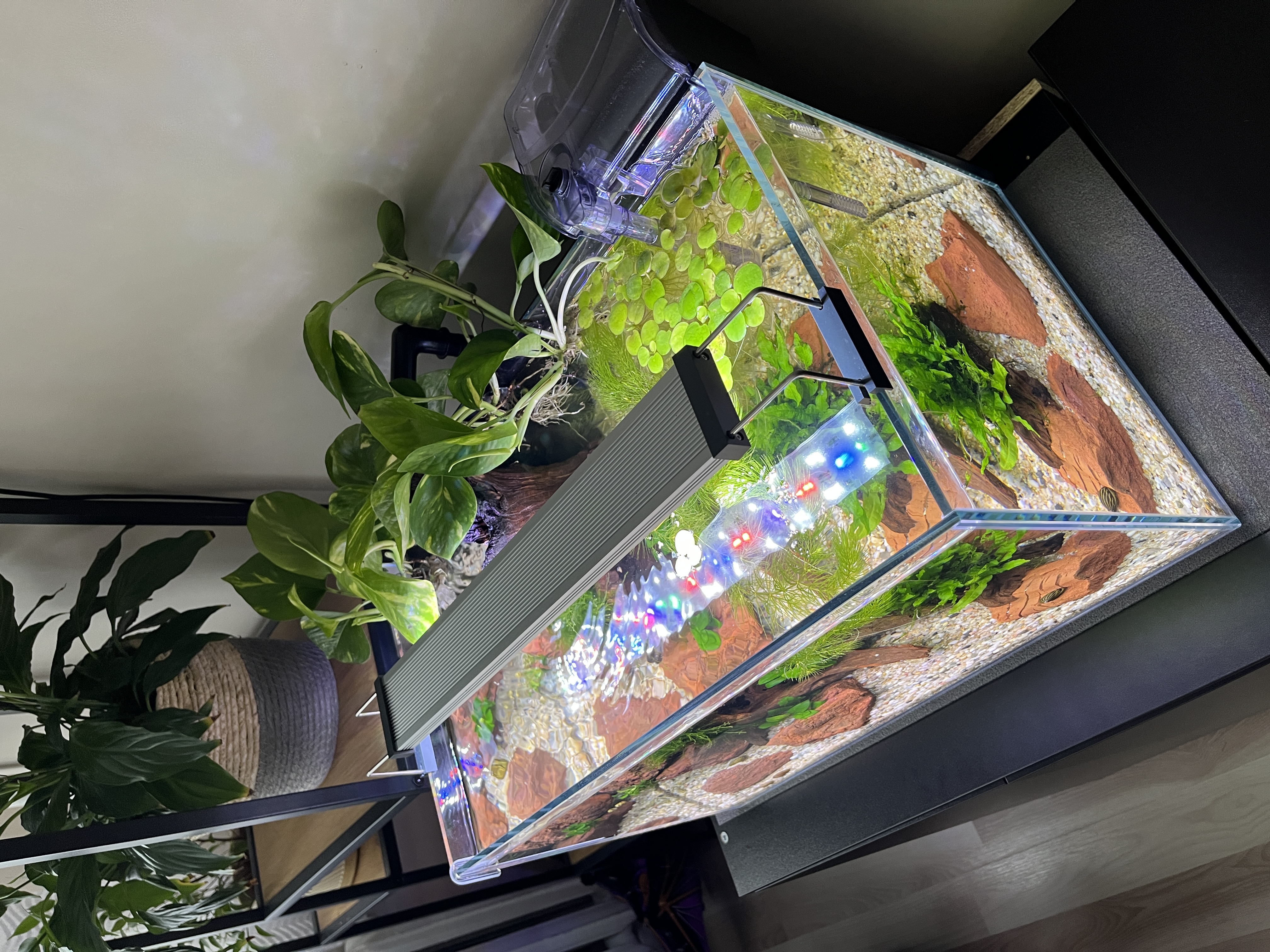 Od początku akwarium prowadzone na wodzie RO z mineralizacją QualDrop. Nie nawożę, jedynie leję przy podmianach trochę bakterii Stability + kontrolnie (z przyzwyczajenia) Seachem Prime. Grzałki nie mam, temperatura oscyluje w granicach 21-23 stopnie.